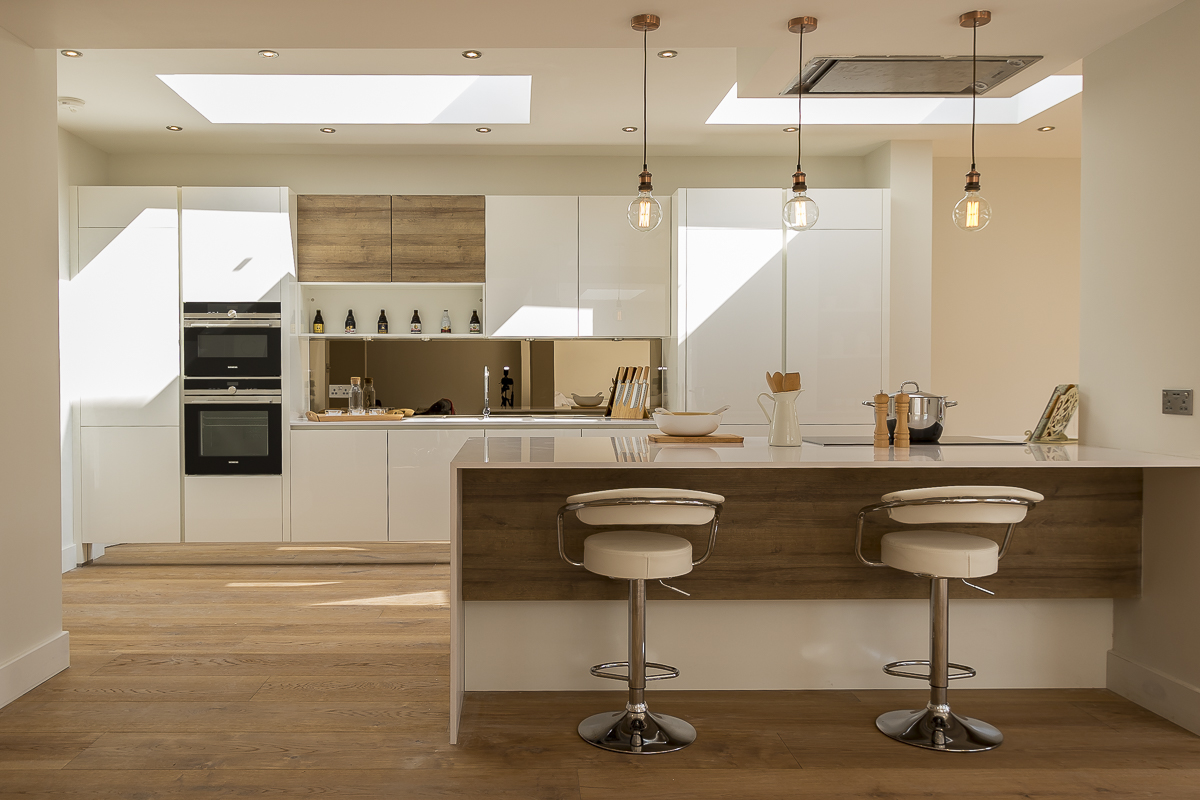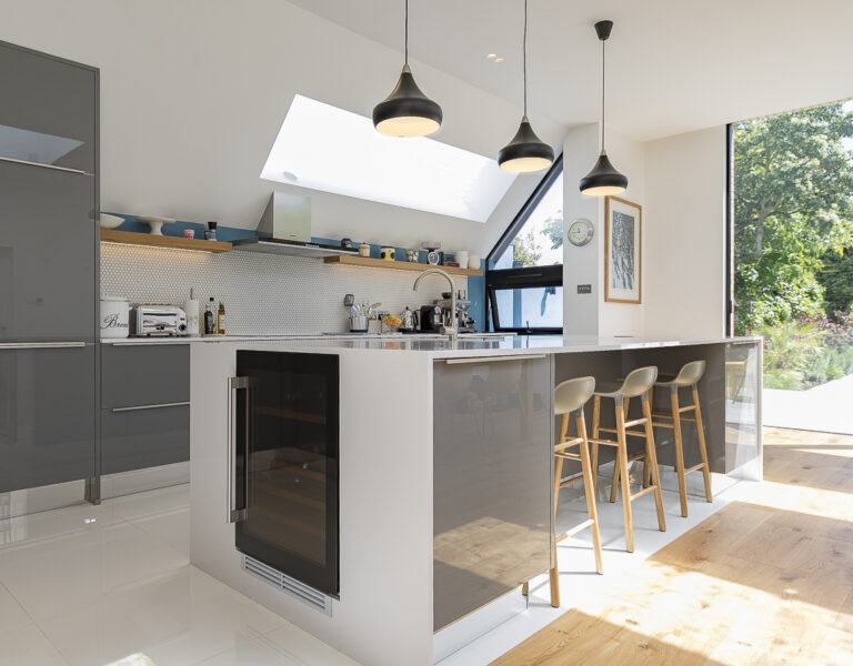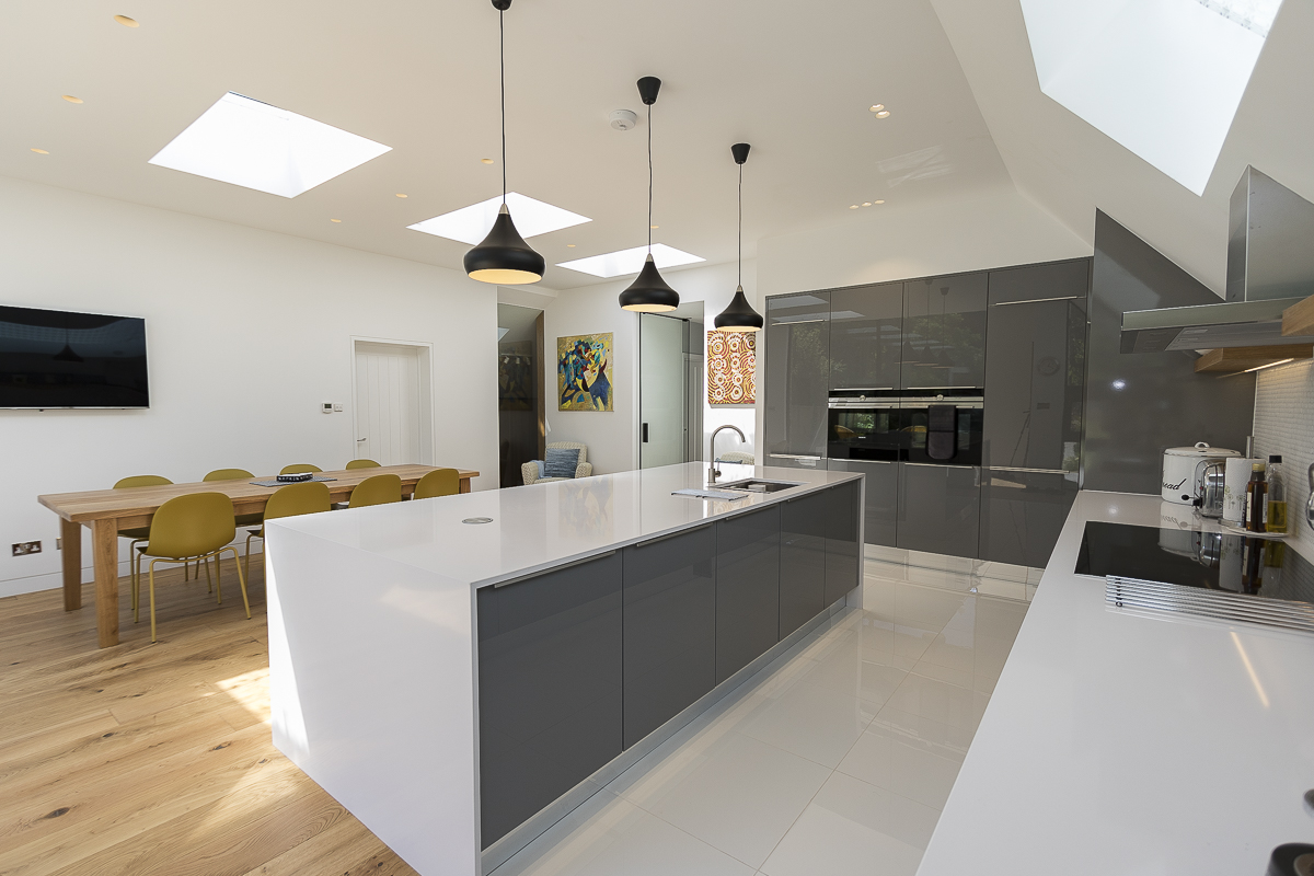 This Leicht kitchen in Kew, London, showcases modern minimalism at its finest. The sleek handleless cabinetry in a high gloss grey finish is perfectly complemented by pristine white worktops and matching flooring, creating a bright and spacious atmosphere.