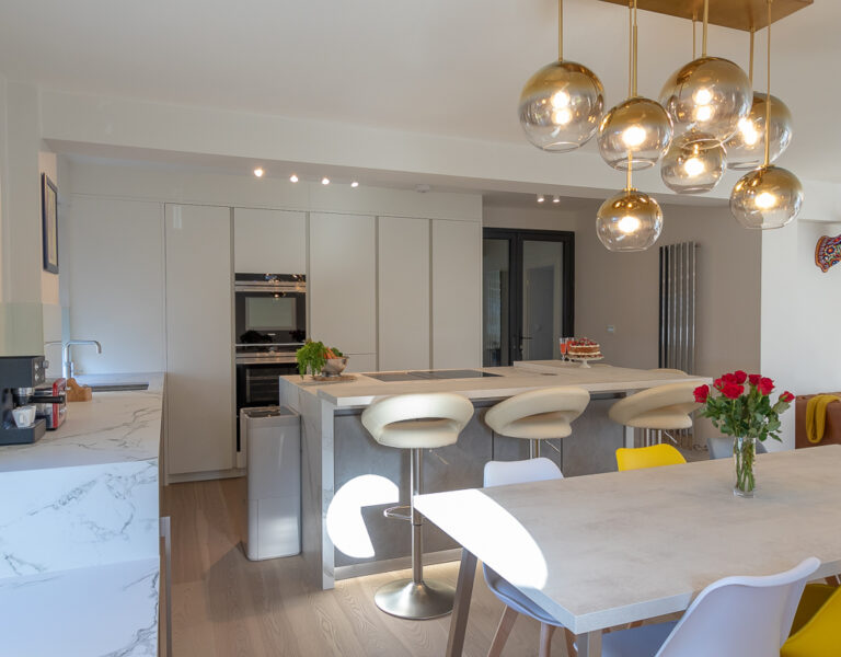 This elegant kitchen embraces a soft, contemporary palette with Leicht handleless cabinetry in Ceres platinum, creating a sleek and understated backdrop.