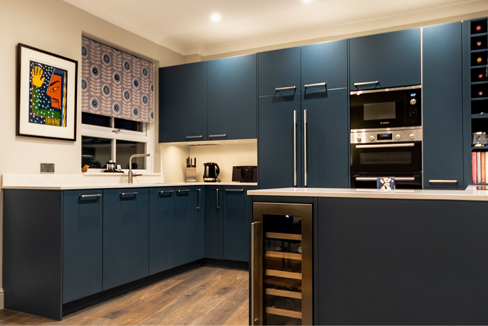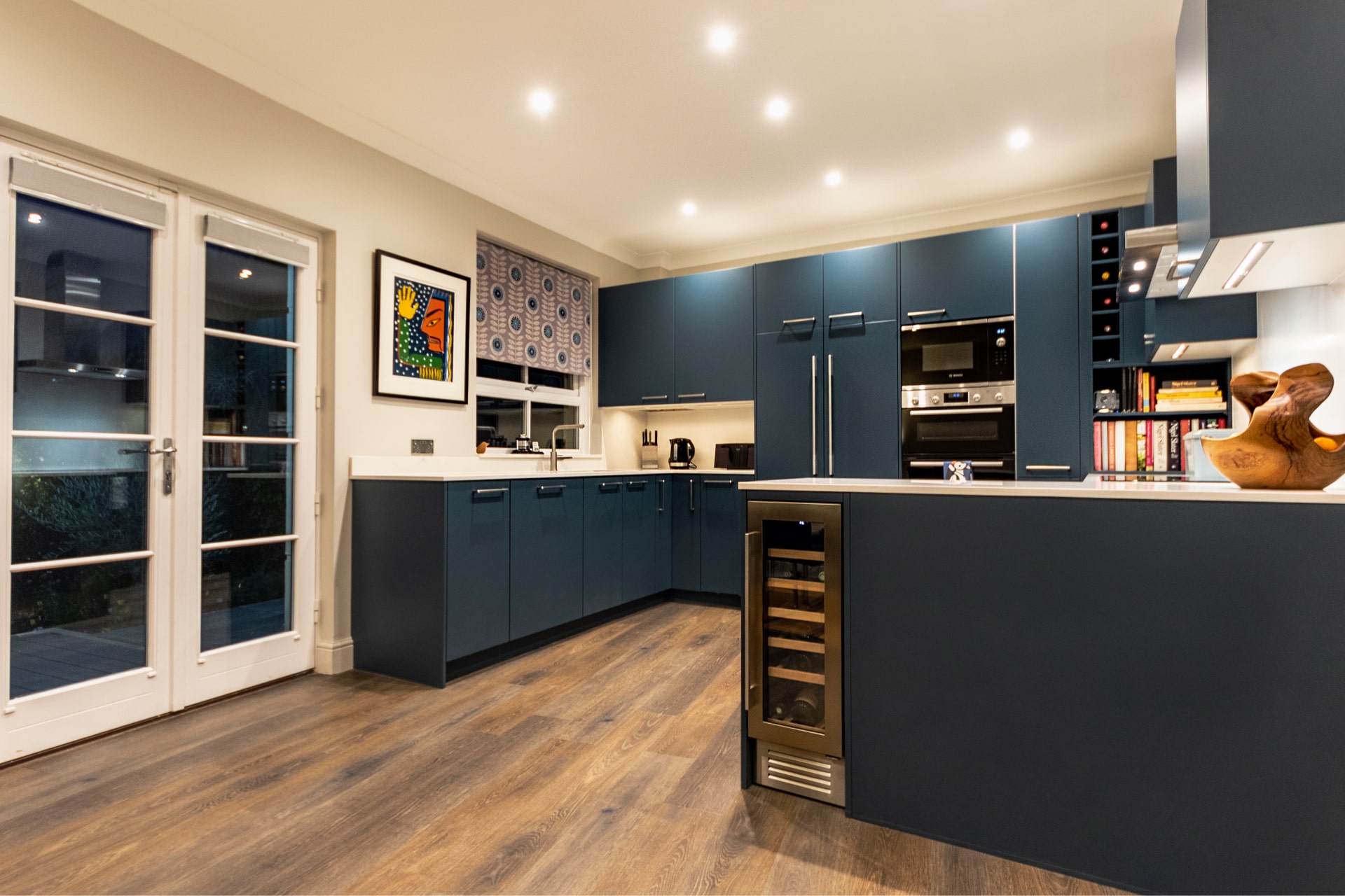This bespoke kitchen combines bold colour with refined detailing. Leicht Classic FS cabinetry in midnight blue, finished with sleek metal bow handles, creates a timeless yet contemporary look. The design is elevated by marble composite Antolini quartz work surfaces, bringing durability and elegance with subtle veining.