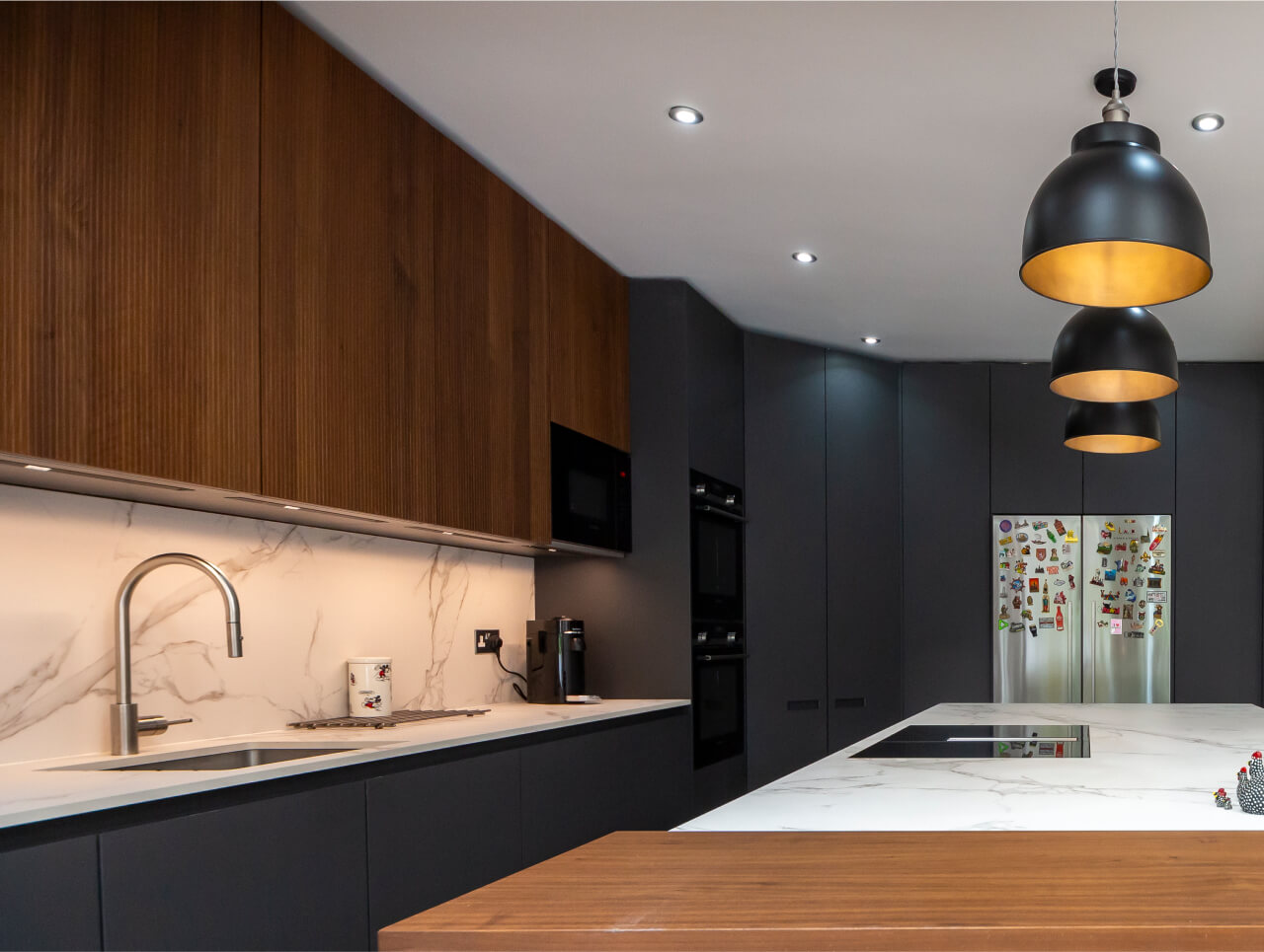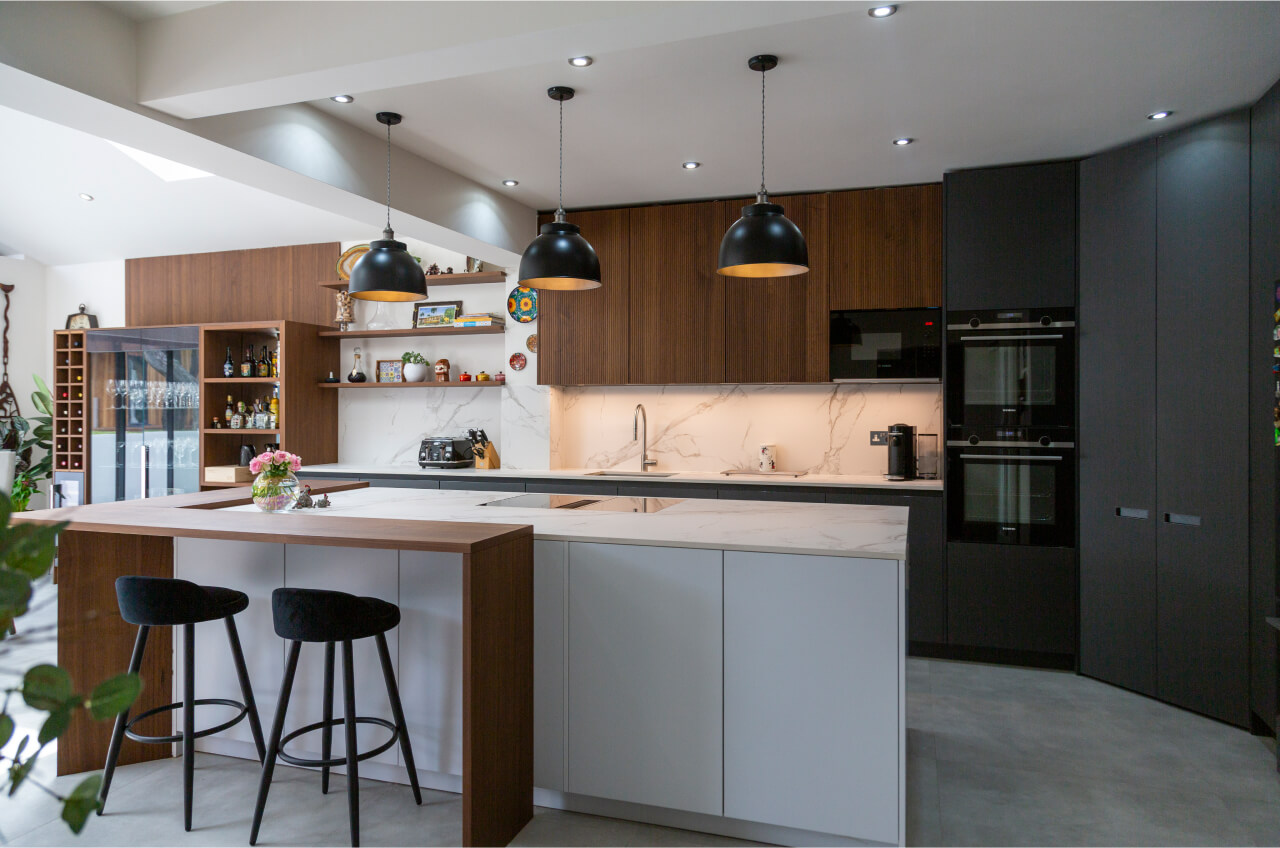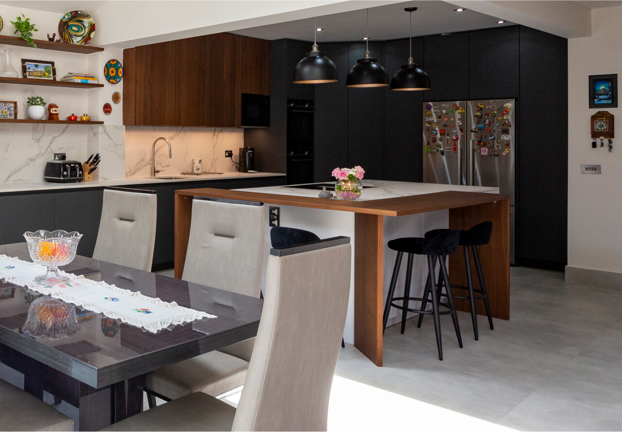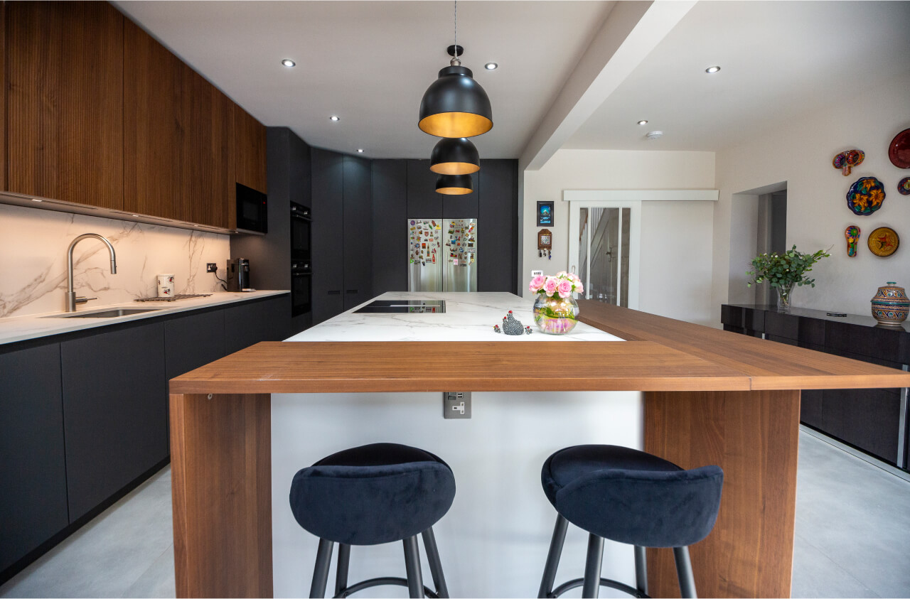 The result is a kitchen that combines striking aesthetics with everyday practicality, designed for both contemporary living and stylish entertaining.
