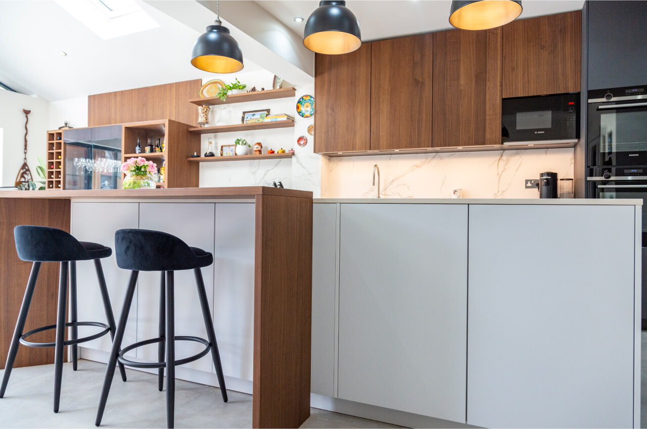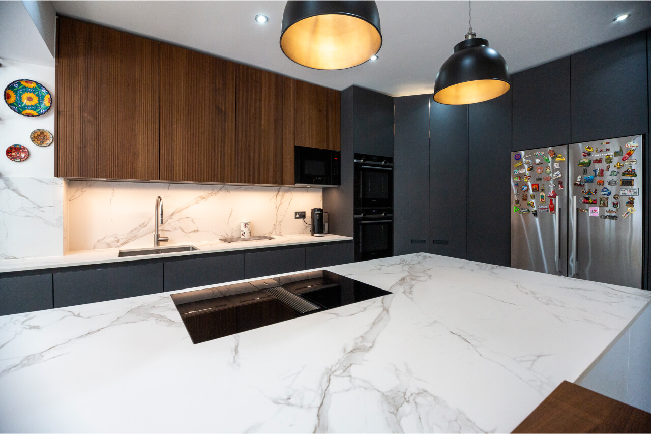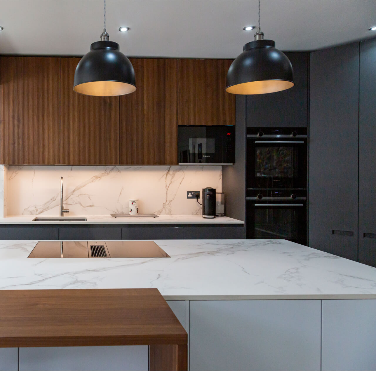 This beautifully balanced kitchen blends natural warmth with modern sophistication. Leicht handleless cabinetry in Bossa walnut pairs seamlessly with Bondi carbon grey, creating depth and contrast. A Dekton Aura 15 worktop and splashback, with its striking marble-inspired veining, completes the refined and durable finish.