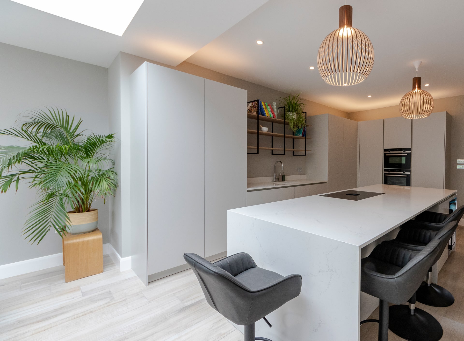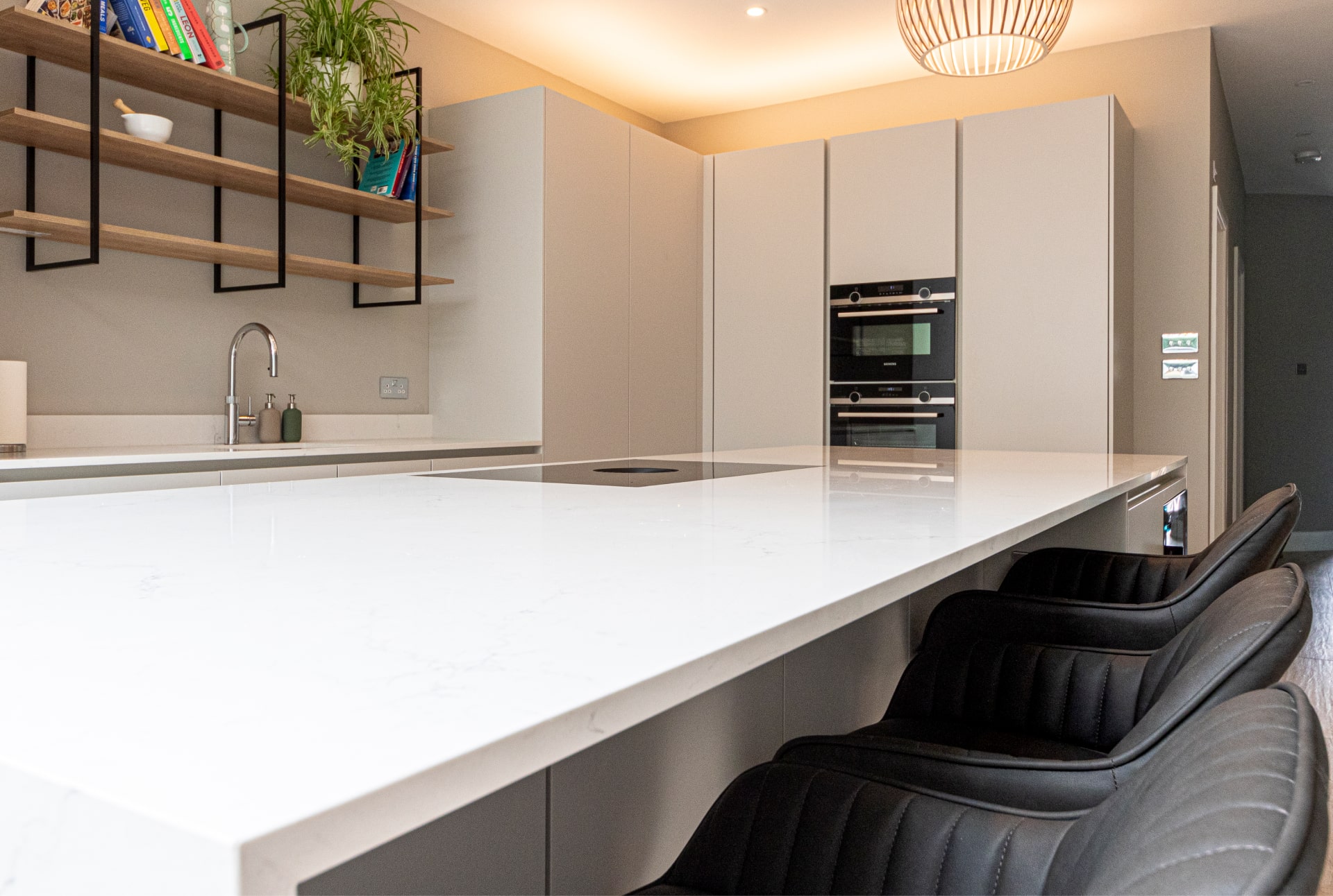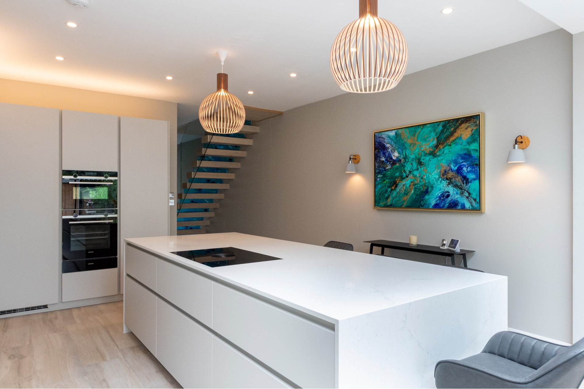 This elegant kitchen embraces a soft, contemporary palette with Leicht handleless cabinetry in Ceres platinum, creating a sleek and understated backdrop. The marble composite work surfaces and Classic Quartz Miserio add a timeless, natural texture while ensuring durability for everyday use.