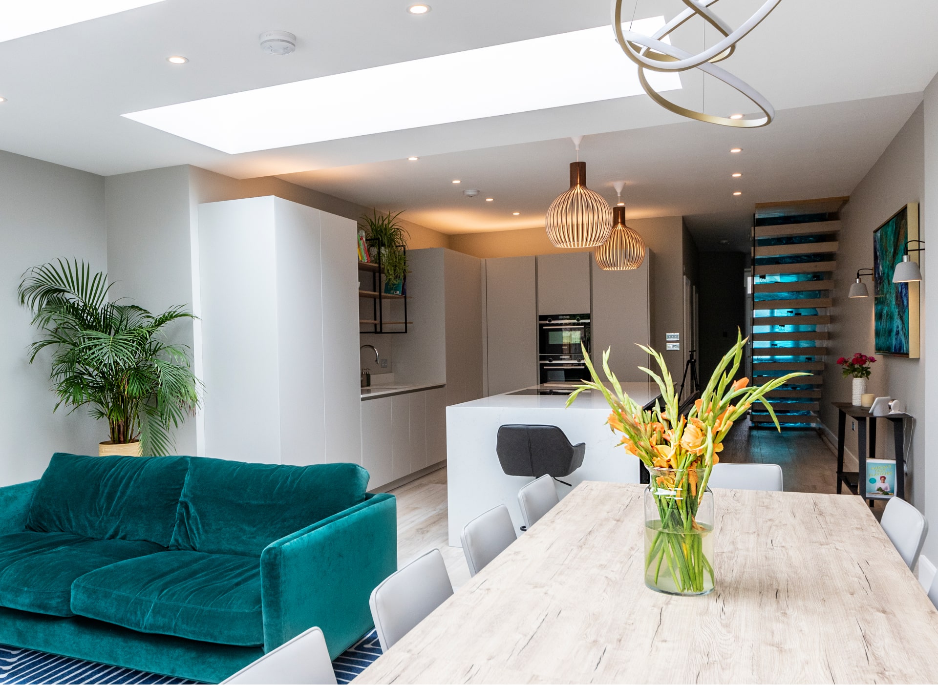 Premium Siemens integrated appliances, a Bora Pure cooktop, and a mix of stainless steel and black finishes provide modern functionality within the minimalist design. Integrated LED lighting enhances both atmosphere and usability, while the choice of bright coloured furniture and accessories brings vibrancy and personality to the space.