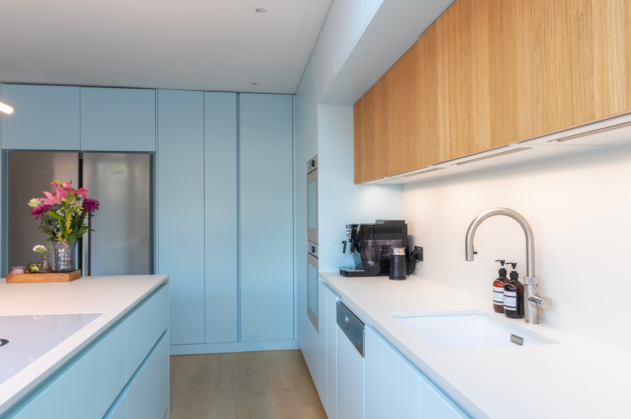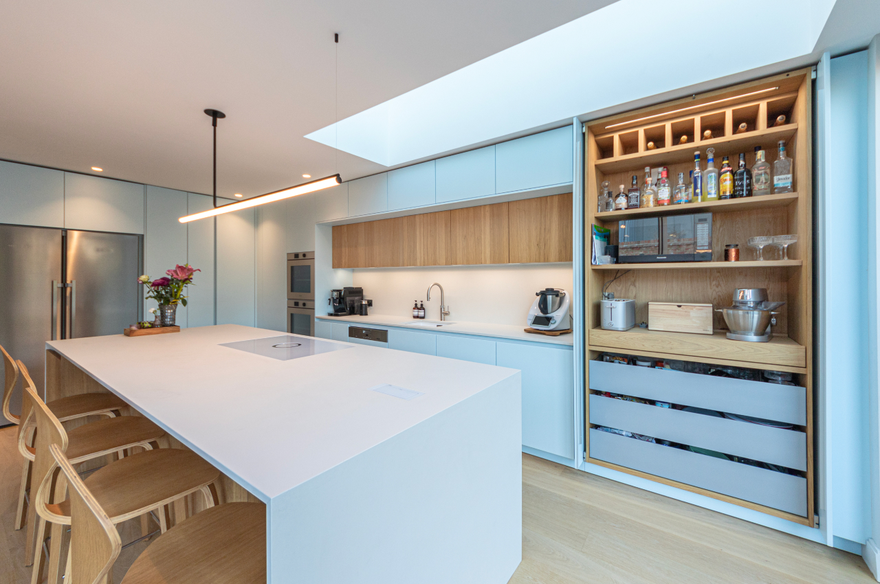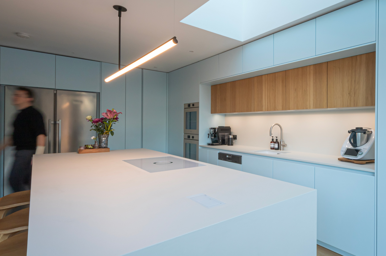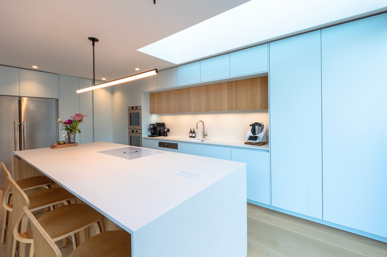 This contemporary kitchen combines refined design with everyday practicality. The handleless cabinetry is finished in a fully lacquered RAL blue, paired with striking Bossa lined walnut to create warmth and texture. A seamless Dekton worktop and matching splashback complete the clean, modern look while providing durability and easy maintenance.