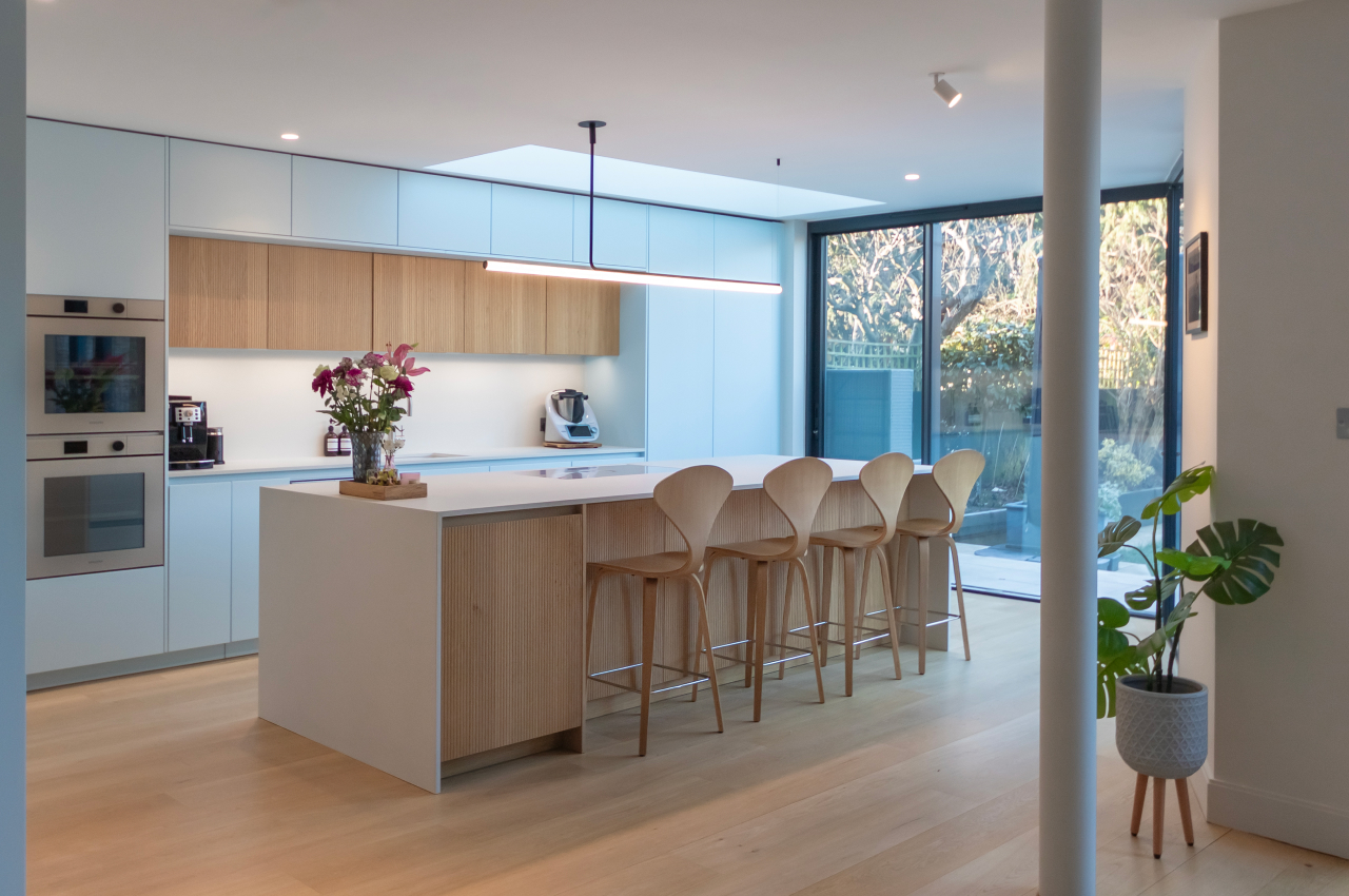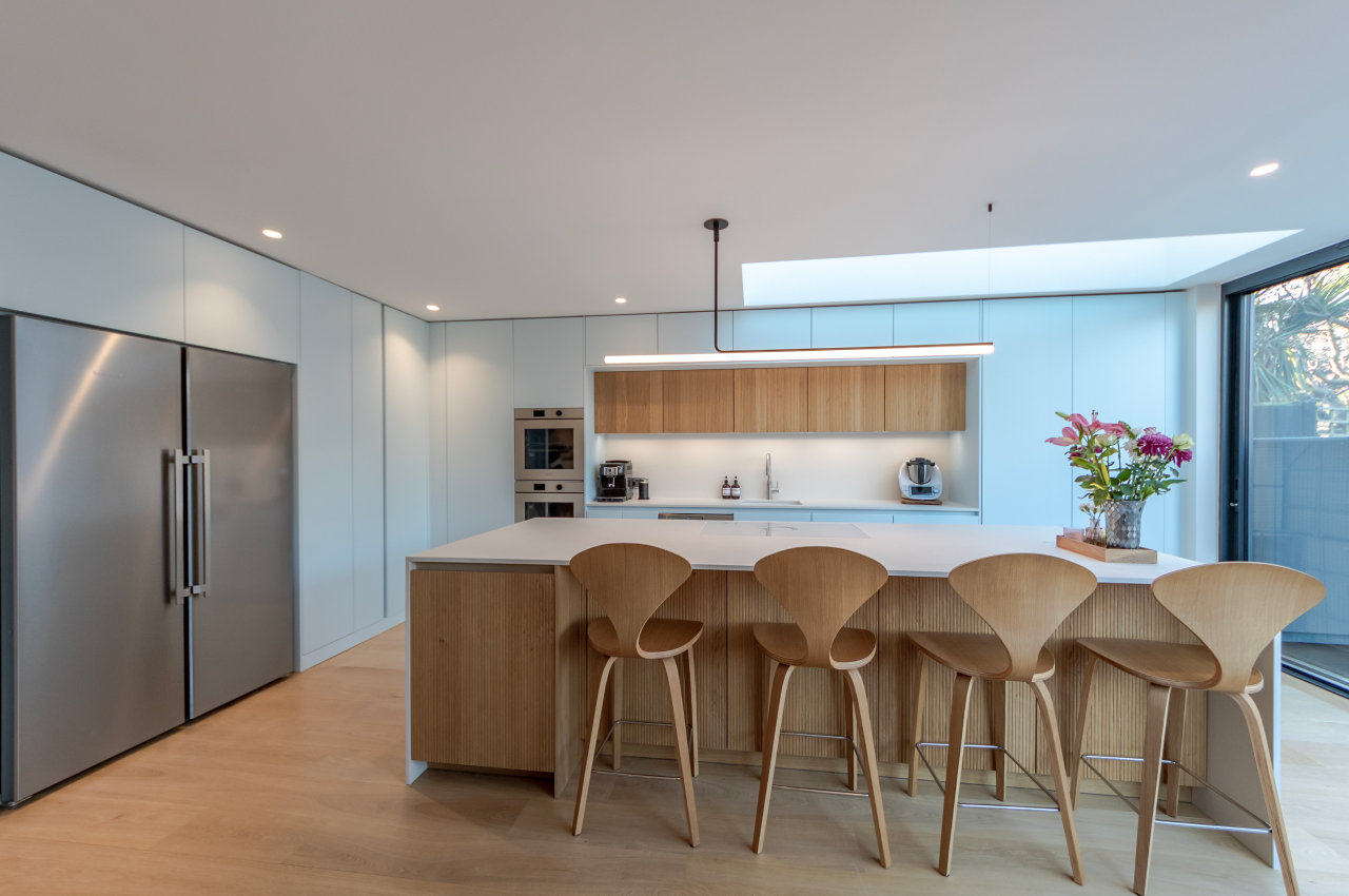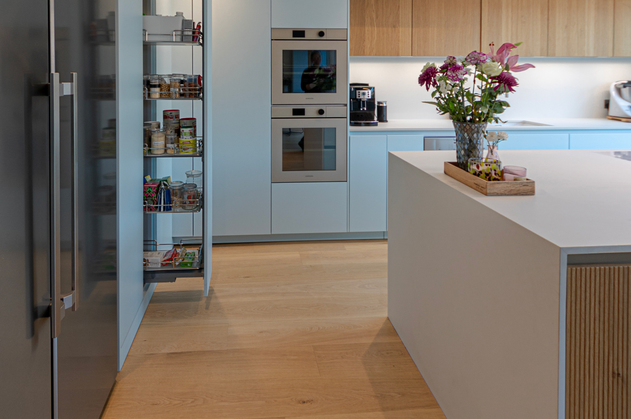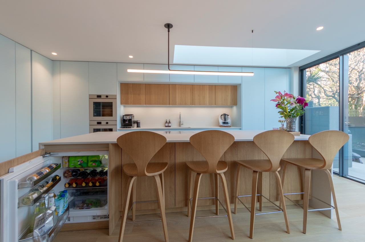 This contemporary kitchen combines refined design with everyday practicality. The handleless cabinetry is finished in a fully lacquered RAL blue, paired with striking Bossa lined walnut to create warmth and texture. A seamless Dekton worktop and matching splashback complete the clean, modern look while providing durability and easy maintenance.