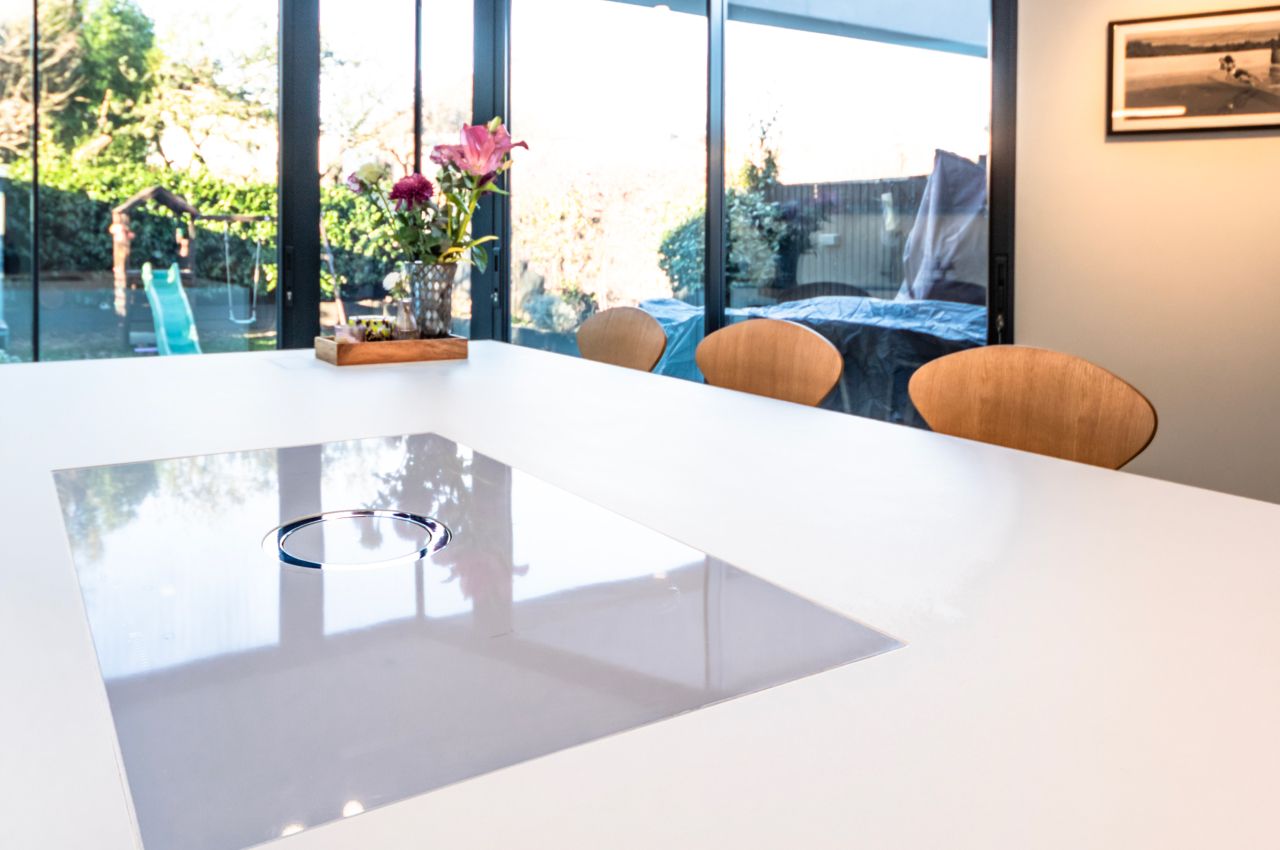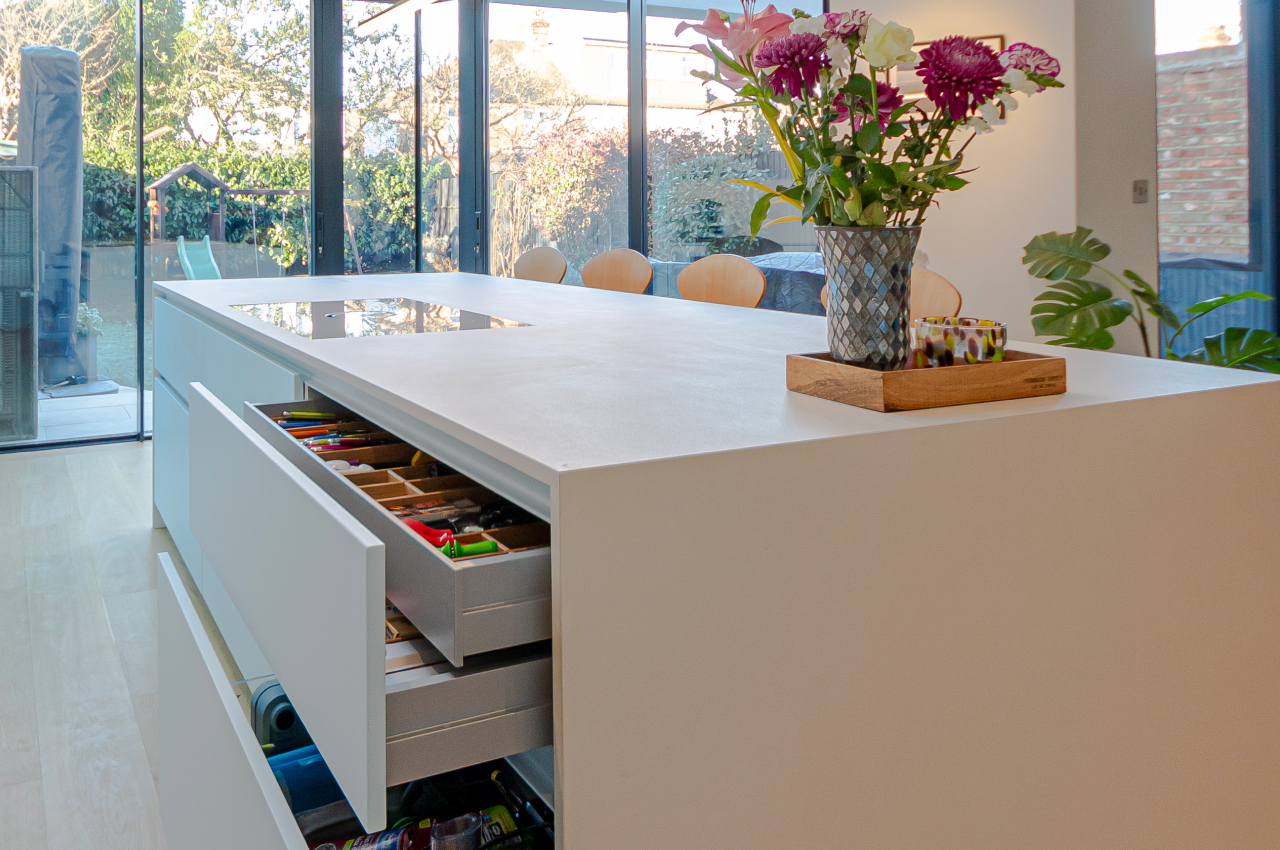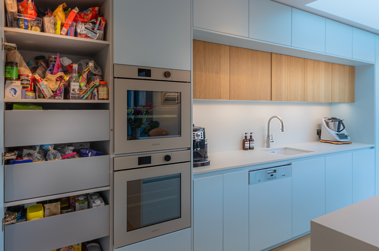 The kitchen is fully equipped with premium appliances from Samsung, Elica, and Miele, along with a Quooker boiling water tap for ultimate convenience. Thoughtful details elevate the design, including a pocket door larder with internal drawers and integrated lighting, an Elica venting hob, and a tall corner unit with four pull-out trays for maximum storage. Bespoke-height tall units ensure the design is tailored perfectly to the space.