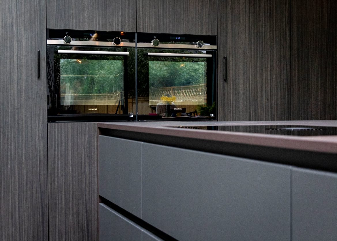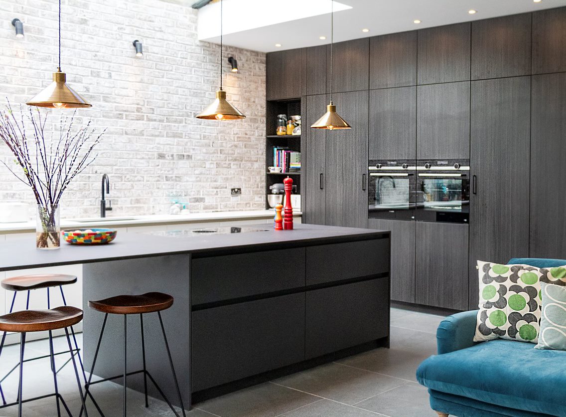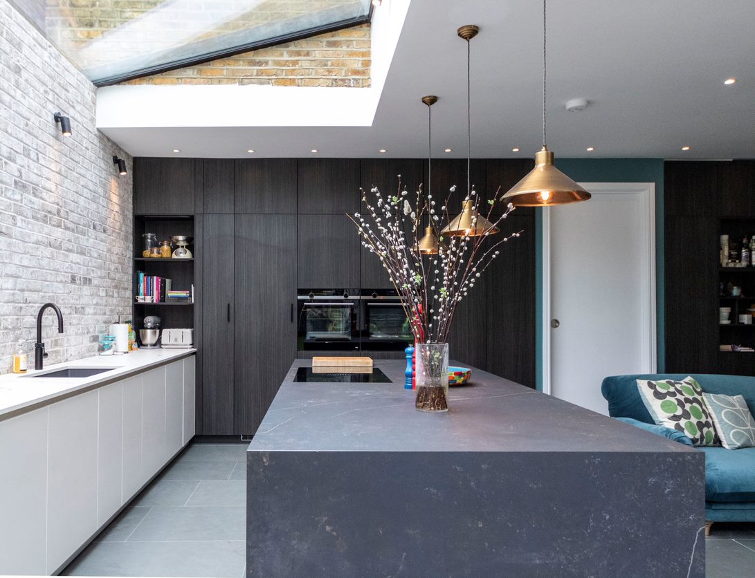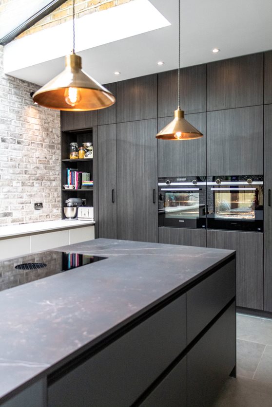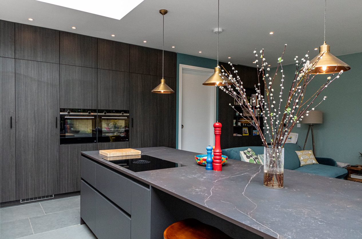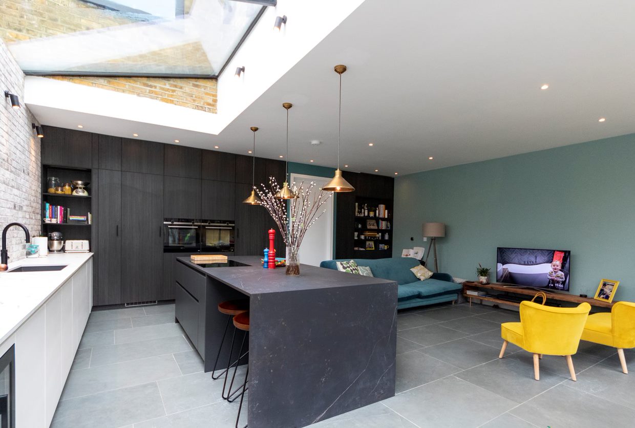 Light and dark defines this stunning open-plan kitchen completed by Richmond Kitchens in Kingston, boasting quality Leitch German handleless cabinetry teamed with Dekton composite work surfaces.