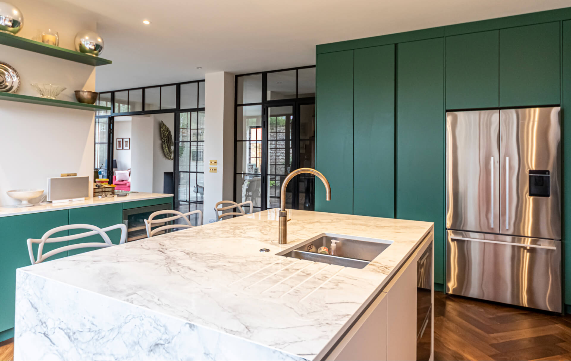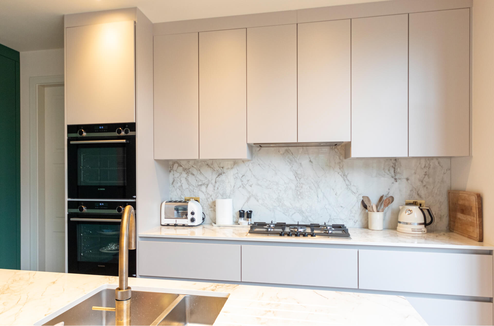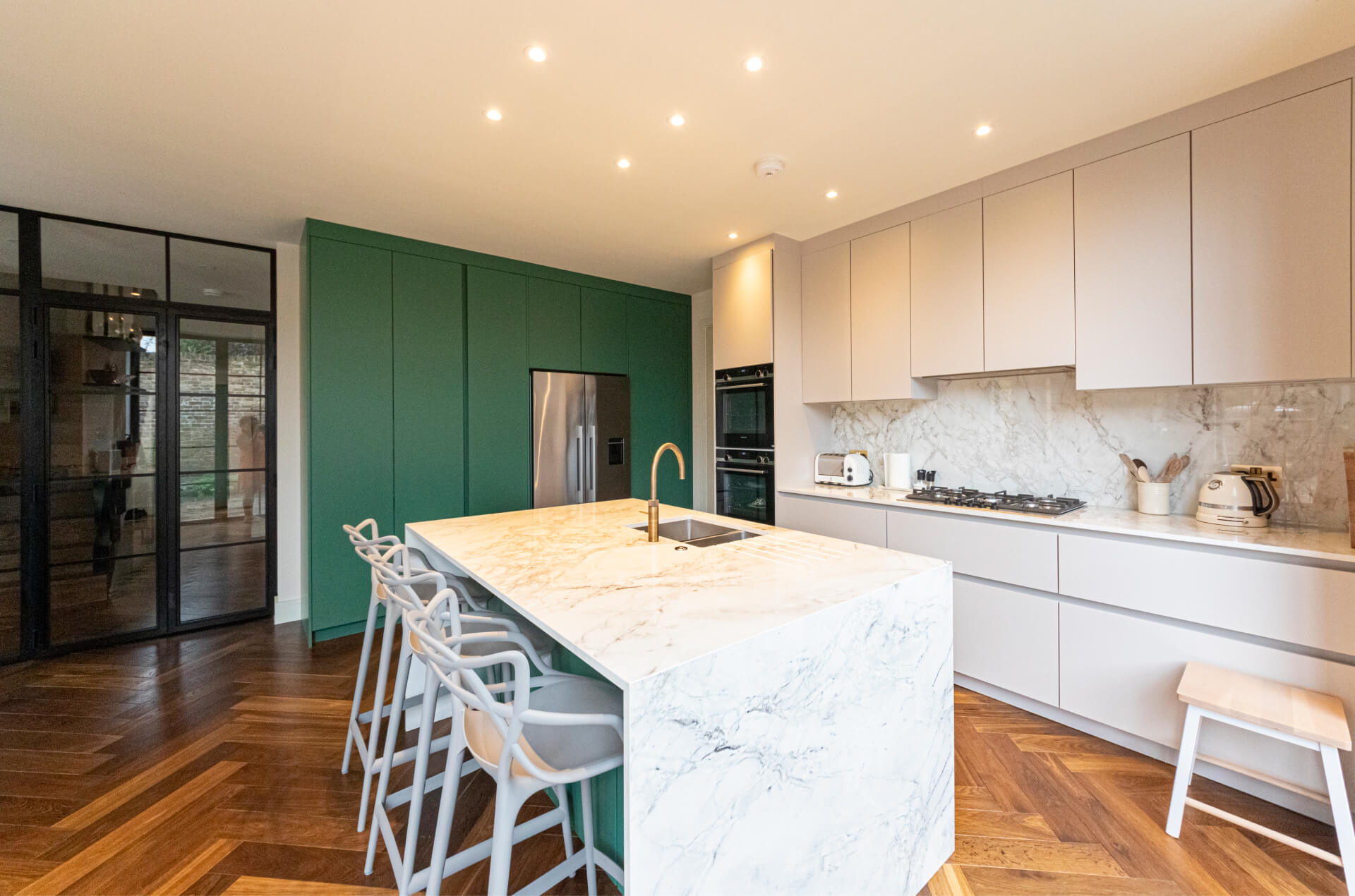 This striking kitchen balances elegance with individuality, combining Leicht handleless cabinetry in soft Mohair with a bold bespoke dark green finish. The marble-inspired Dekton Bergen work surfaces and splashback add texture and refinement, creating a durable yet luxurious centrepiece.