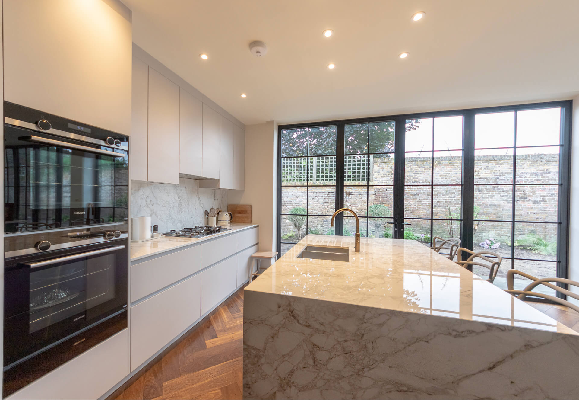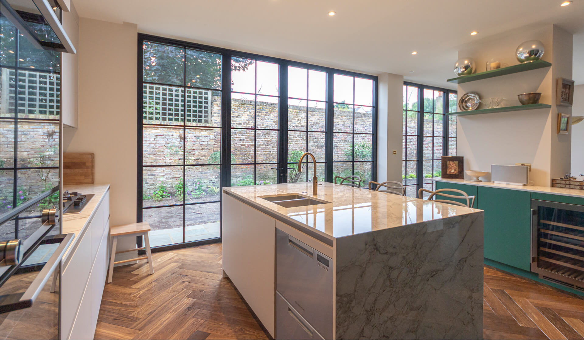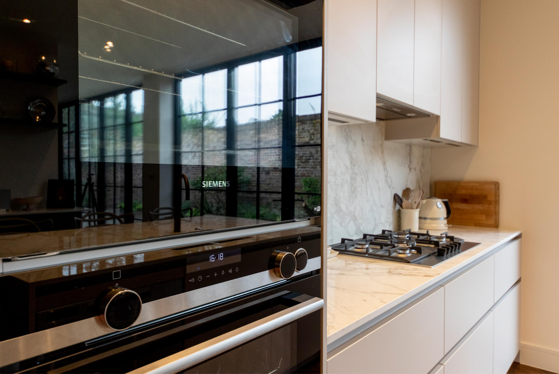 This striking kitchen balances elegance with individuality, combining Leicht handleless cabinetry in soft Mohair with a bold bespoke dark green finish. The marble-inspired Dekton Bergen work surfaces and splashback add texture and refinement, creating a durable yet luxurious centrepiece.