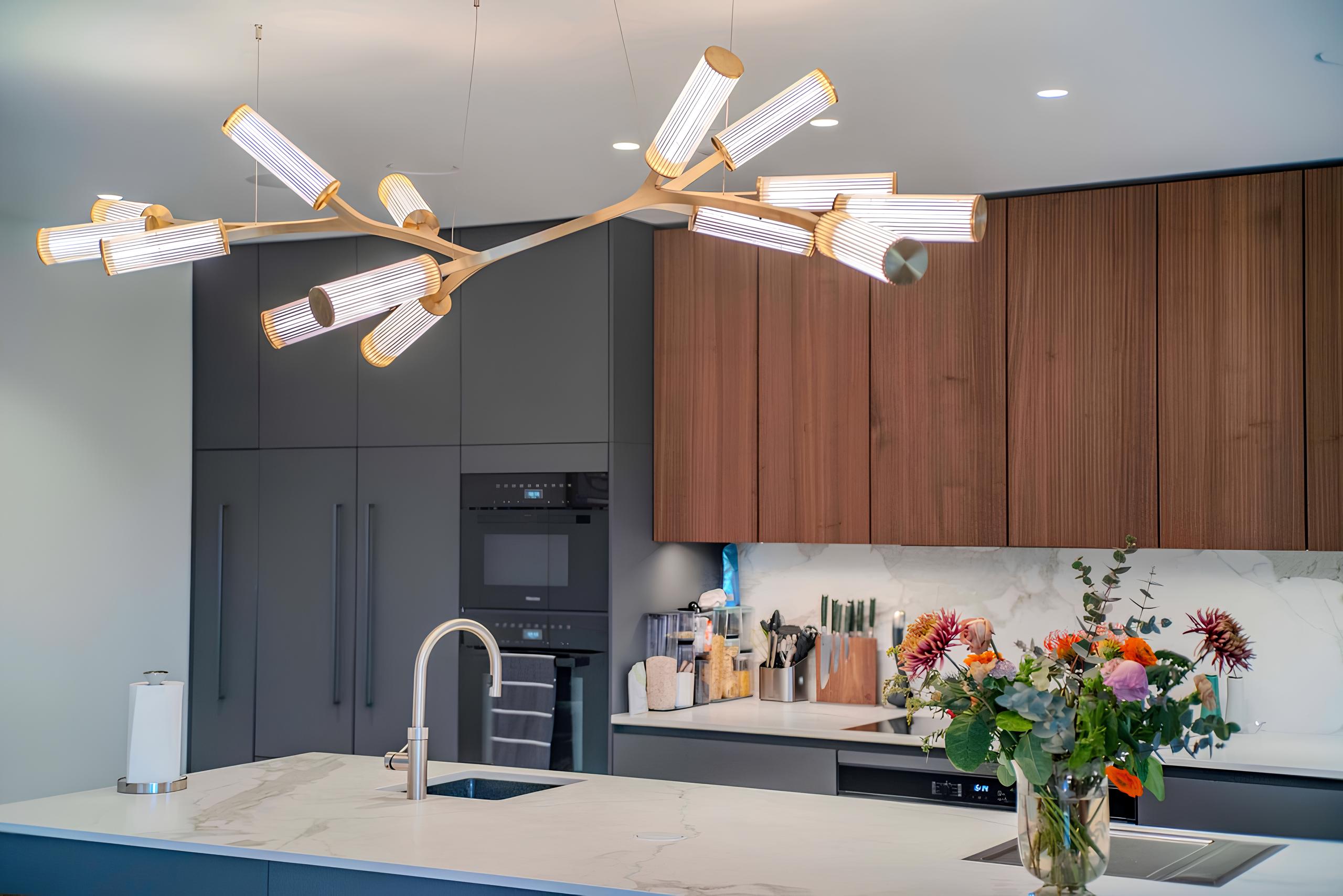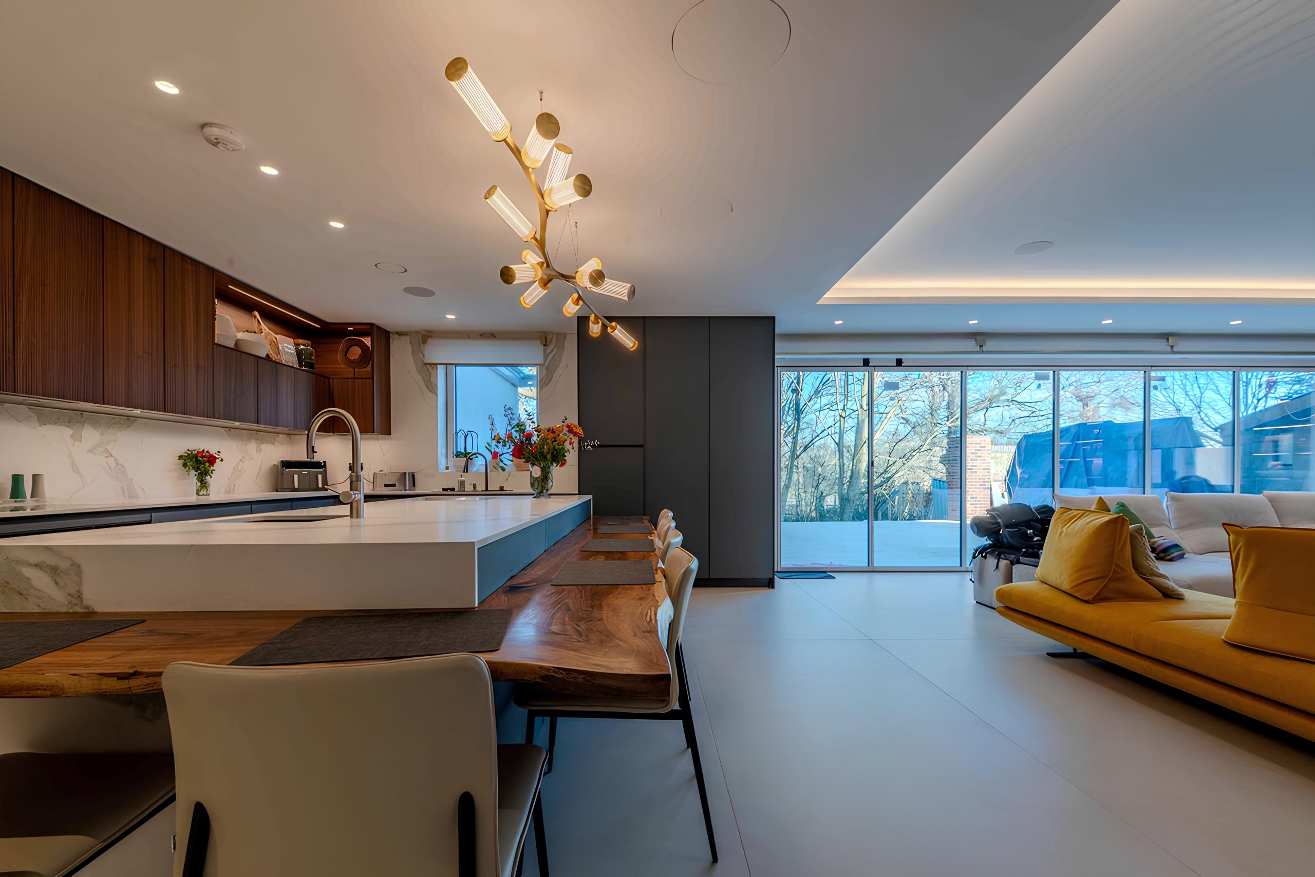 At the heart of the kitchen, the island is designed for both performance and socializing, featuring a Bora Professional Tepanyaki cooktop with an integrated extractor for a seamless, high-end cooking experience. Thoughtfully placed corner open shelving in wood veneer with integrated lighting enhances both functionality and ambiance, providing an elegant space for display.