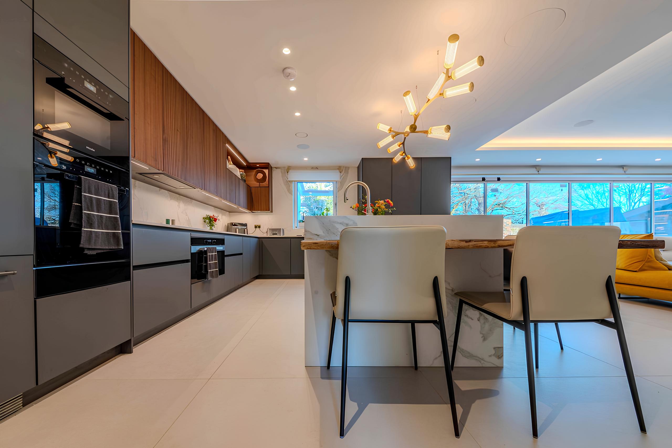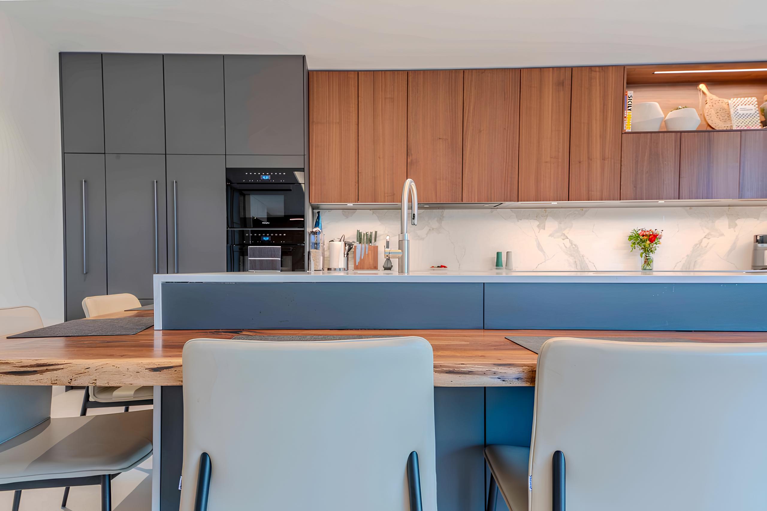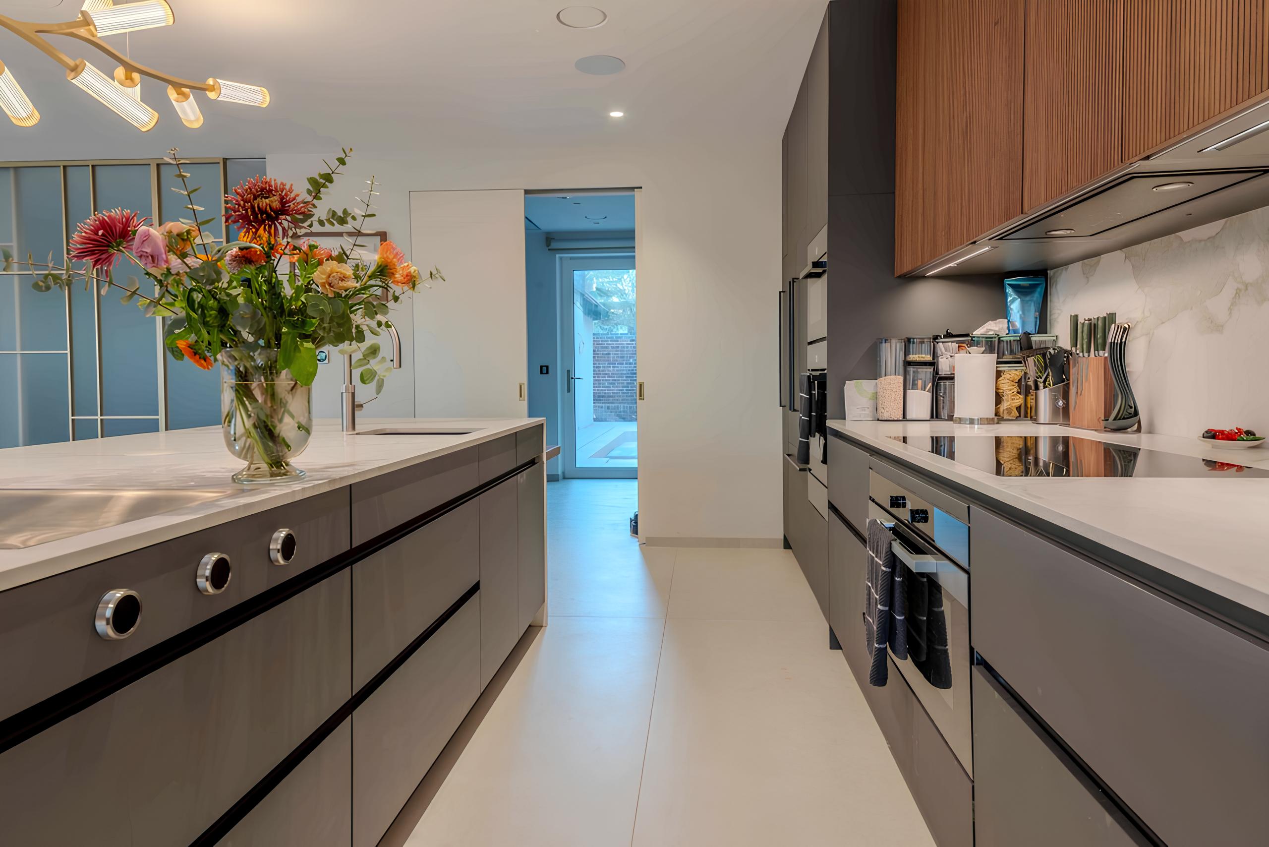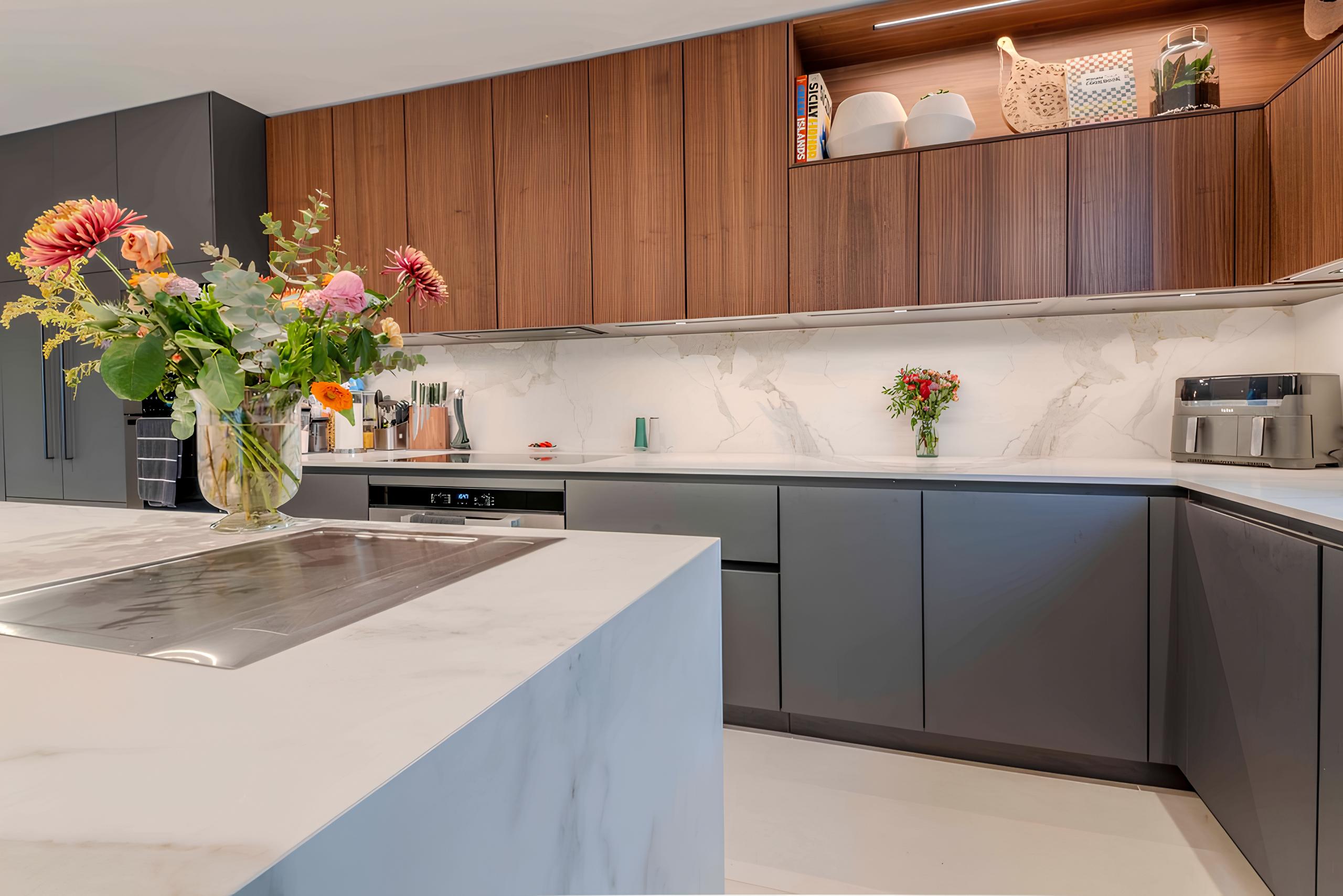 This beautifully crafted kitchen combines modern elegance with warm natural textures. The cabinetry features Fenix carbon grey, an advanced anti-fingerprint surface that ensures a sleek, matte finish with effortless maintenance. This is paired with lined wood veneer Bossa doors, adding depth and organic texture for a refined contrast. A Neolith worktop extends seamlessly into a dramatic full-height splashback, creating a striking visual statement.