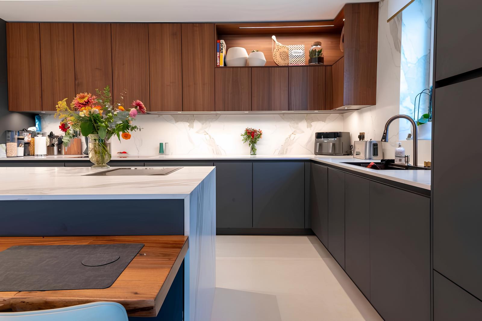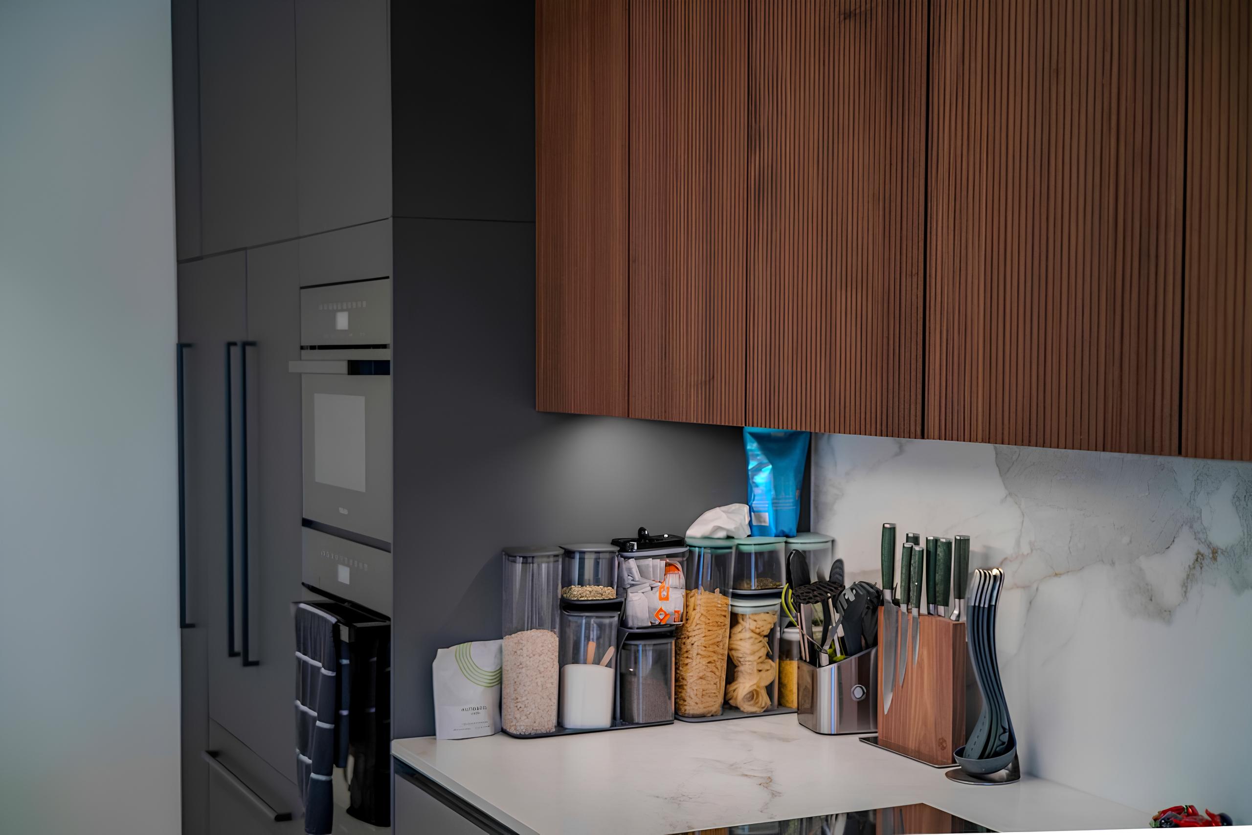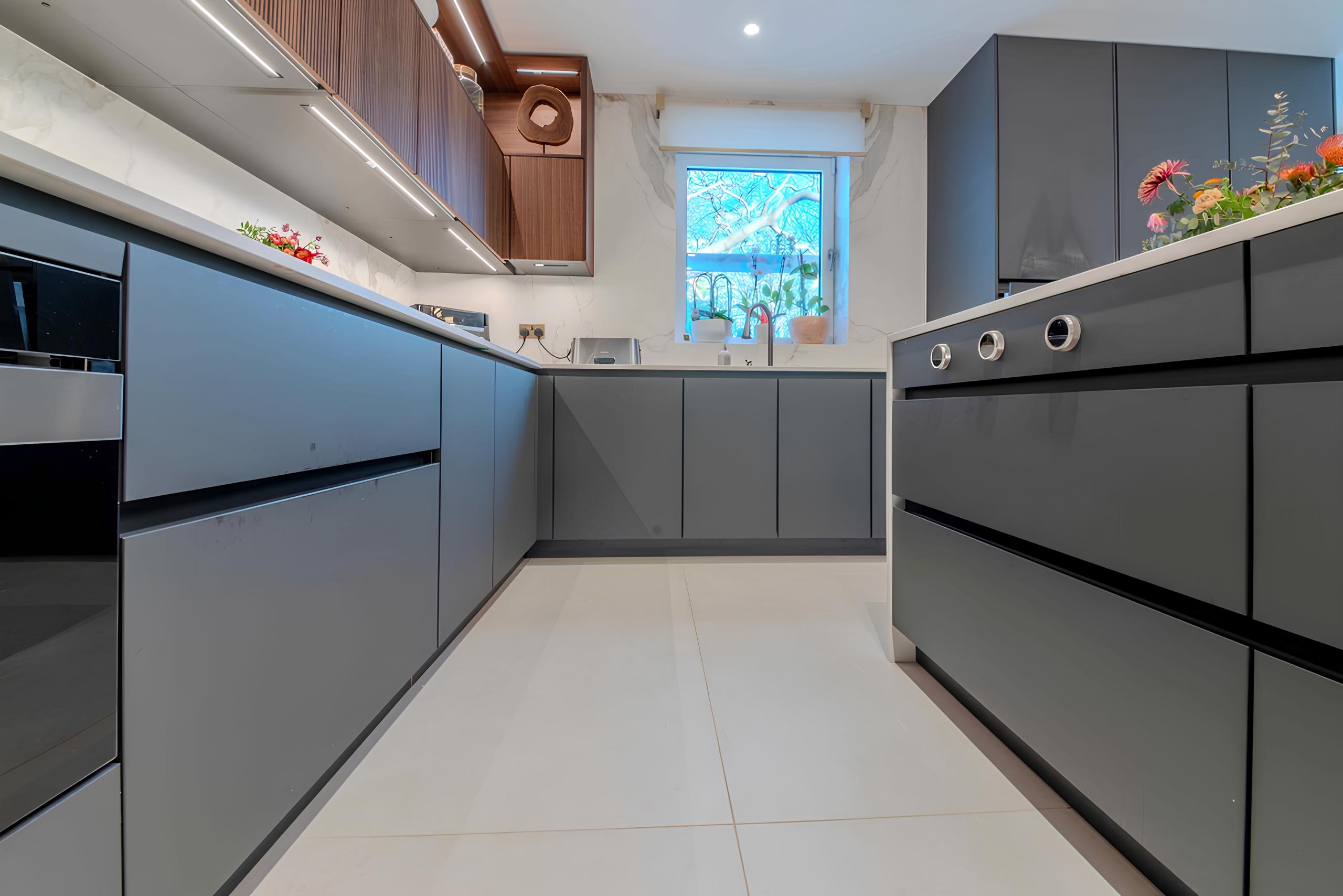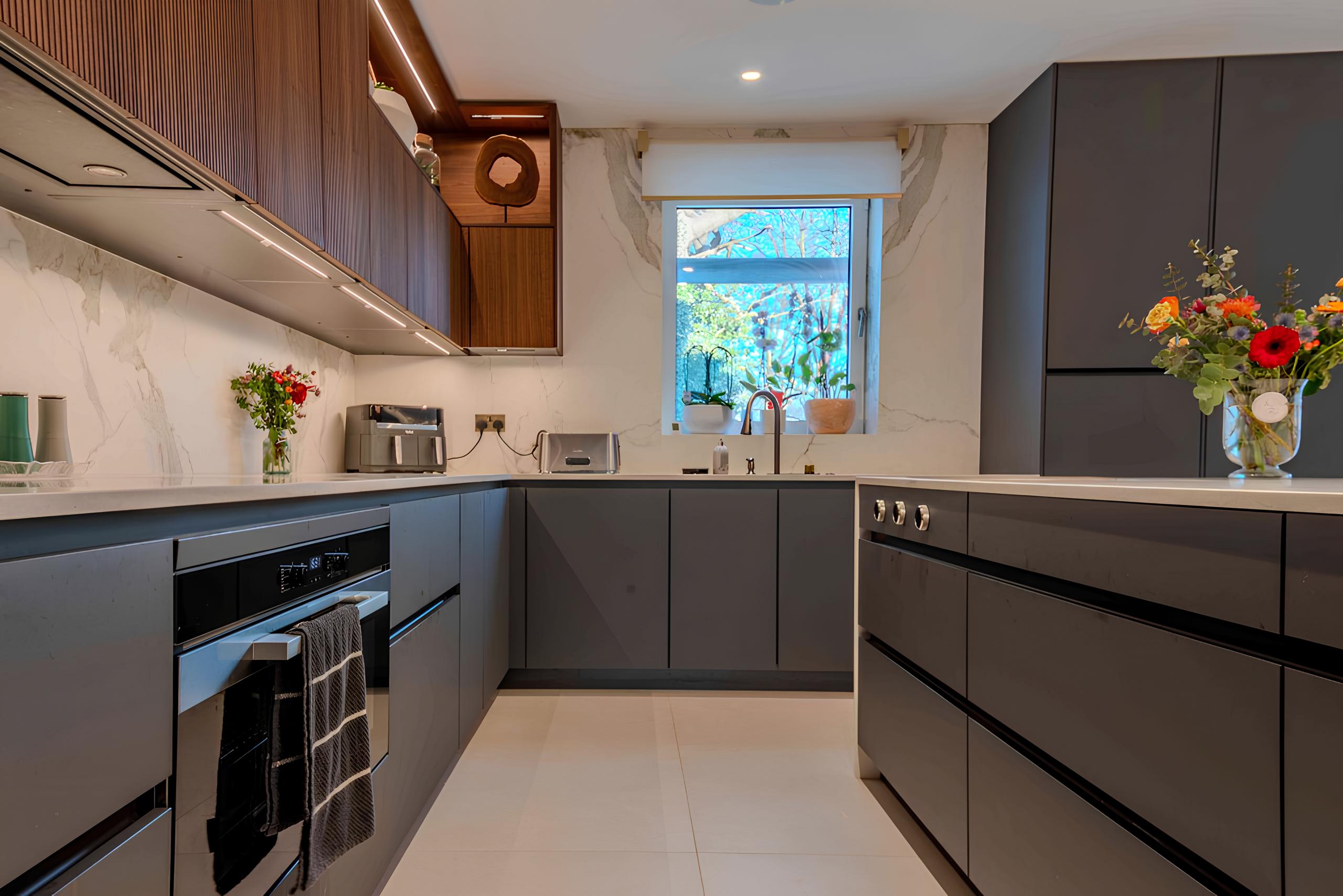 This beautifully crafted kitchen combines modern elegance with warm natural textures. The cabinetry features Fenix carbon grey, an advanced anti-fingerprint surface that ensures a sleek, matte finish with effortless maintenance. This is paired with lined wood veneer Bossa doors, adding depth and organic texture for a refined contrast. A Neolith worktop extends seamlessly into a dramatic full-height splashback, creating a striking visual statement.