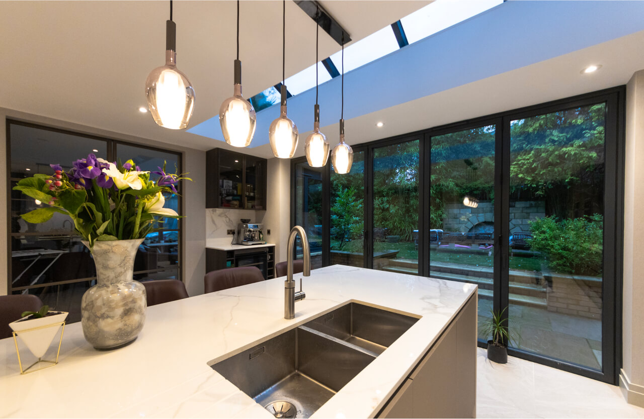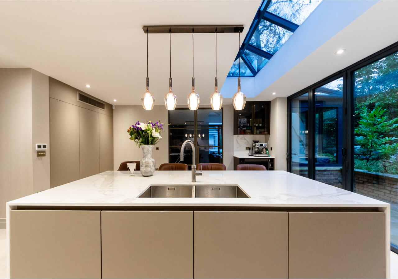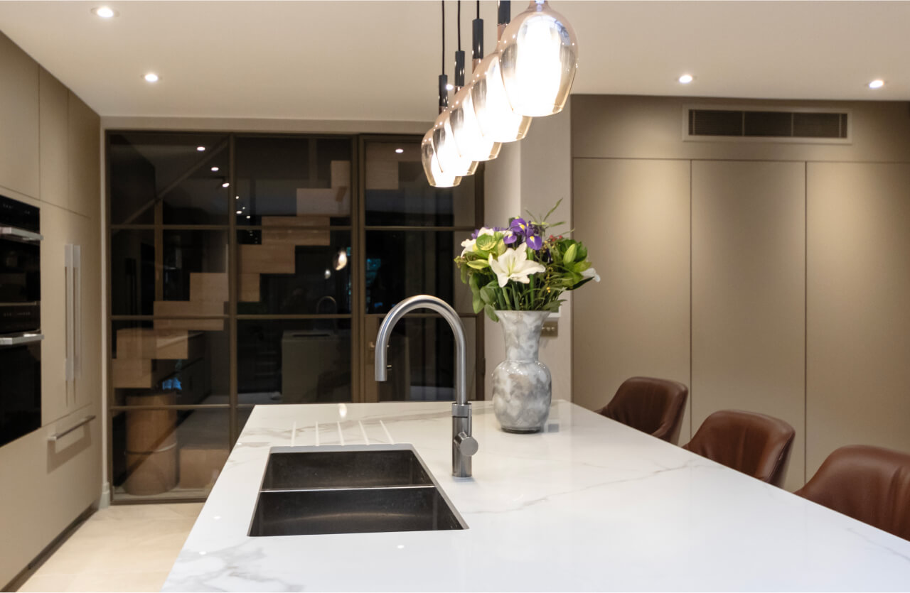 Premium appliances are seamlessly integrated, including Miele appliances and a Fisher & Paykel built-in American style fridge freezer, enhanced by stainless steel and black detailing throughout. Subtle integrated LED lighting elevates both functionality and atmosphere, while the Vero glass unit adds a sleek, architectural feature to the space.