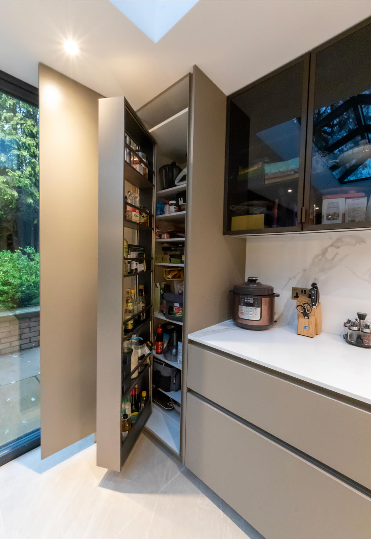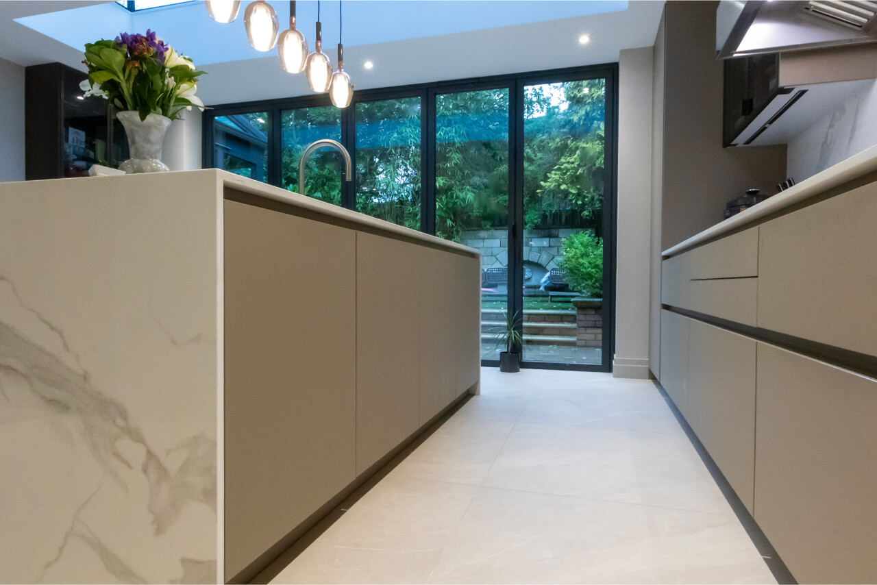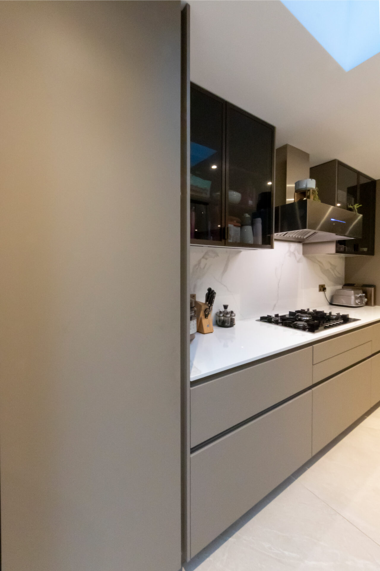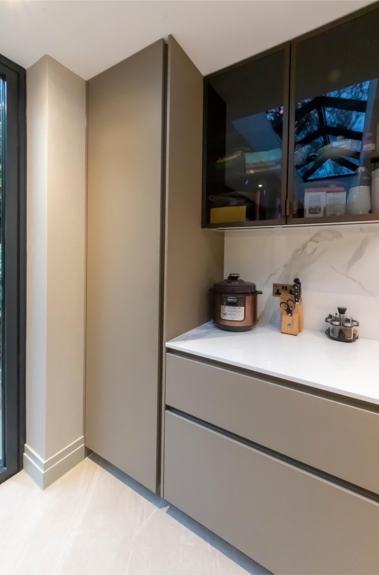 This refined kitchen design brings together understated luxury and modern practicality. The Leicht handleless cabinetry in Fenix F45 Taupe Gray is beautifully complemented by a Vero glass unit, creating a harmonious balance of matte and reflective finishes. A dramatic Neolith Estatuario polished worktop and splashback in 20mm thickness provide a striking centrepiece with timeless marble veining.
