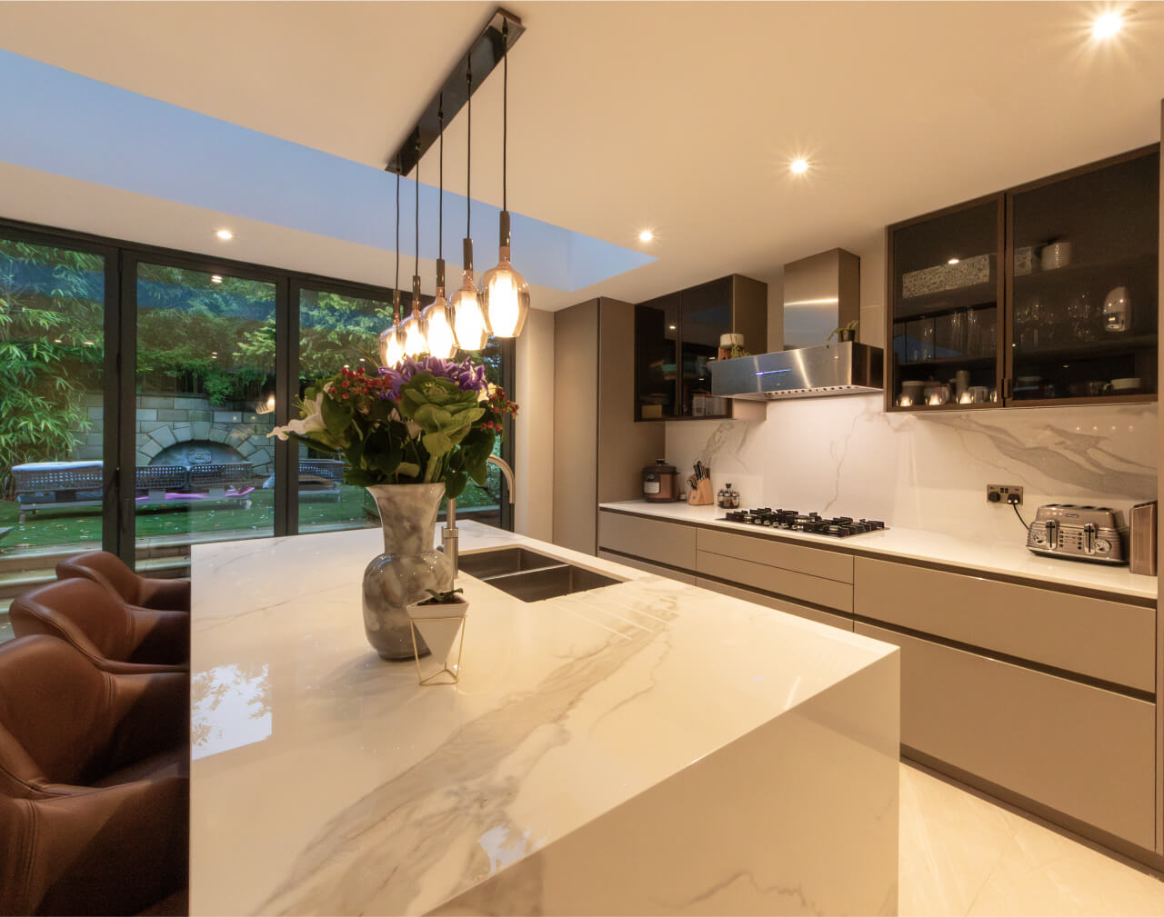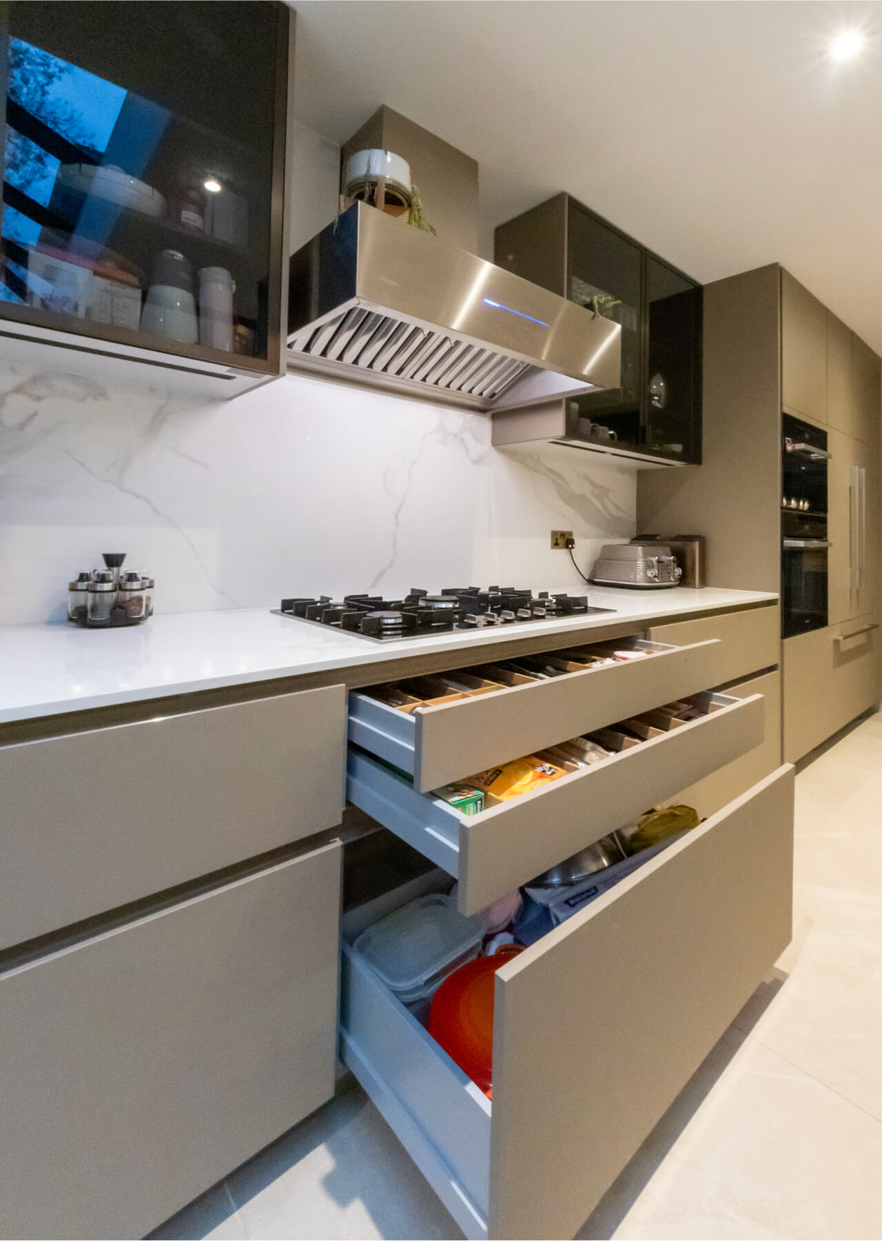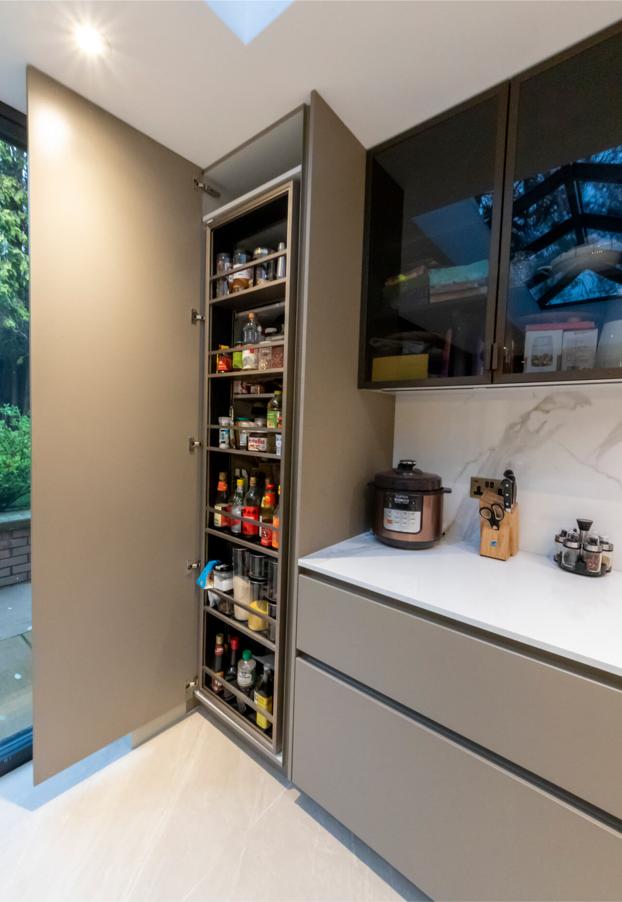 This refined kitchen design brings together understated luxury and modern practicality. The Leicht handleless cabinetry in Fenix F45 Taupe Gray is beautifully complemented by a Vero glass unit, creating a harmonious balance of matte and reflective finishes. A dramatic Neolith Estatuario polished worktop and splashback in 20mm thickness provide a striking centrepiece with timeless marble veining.