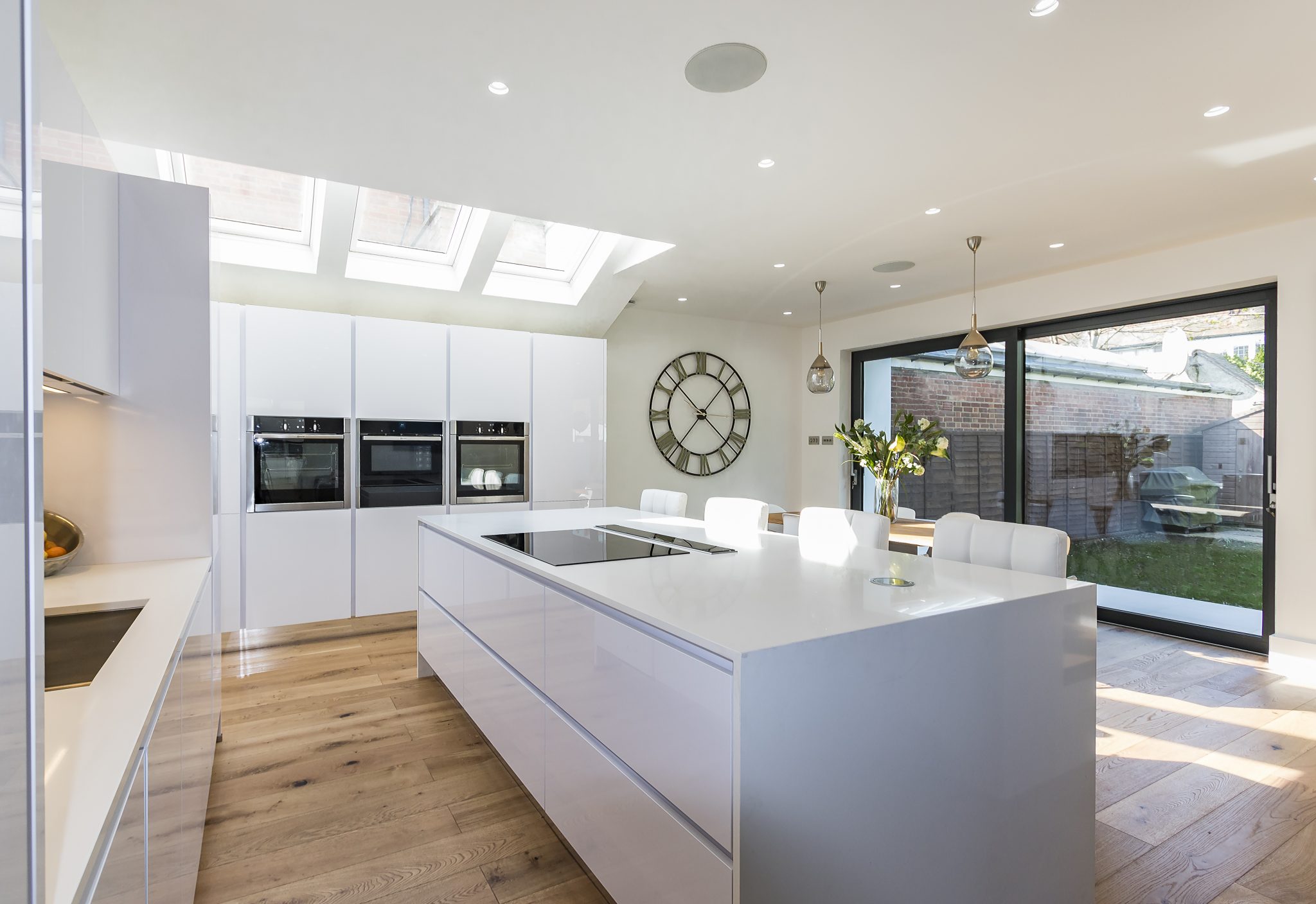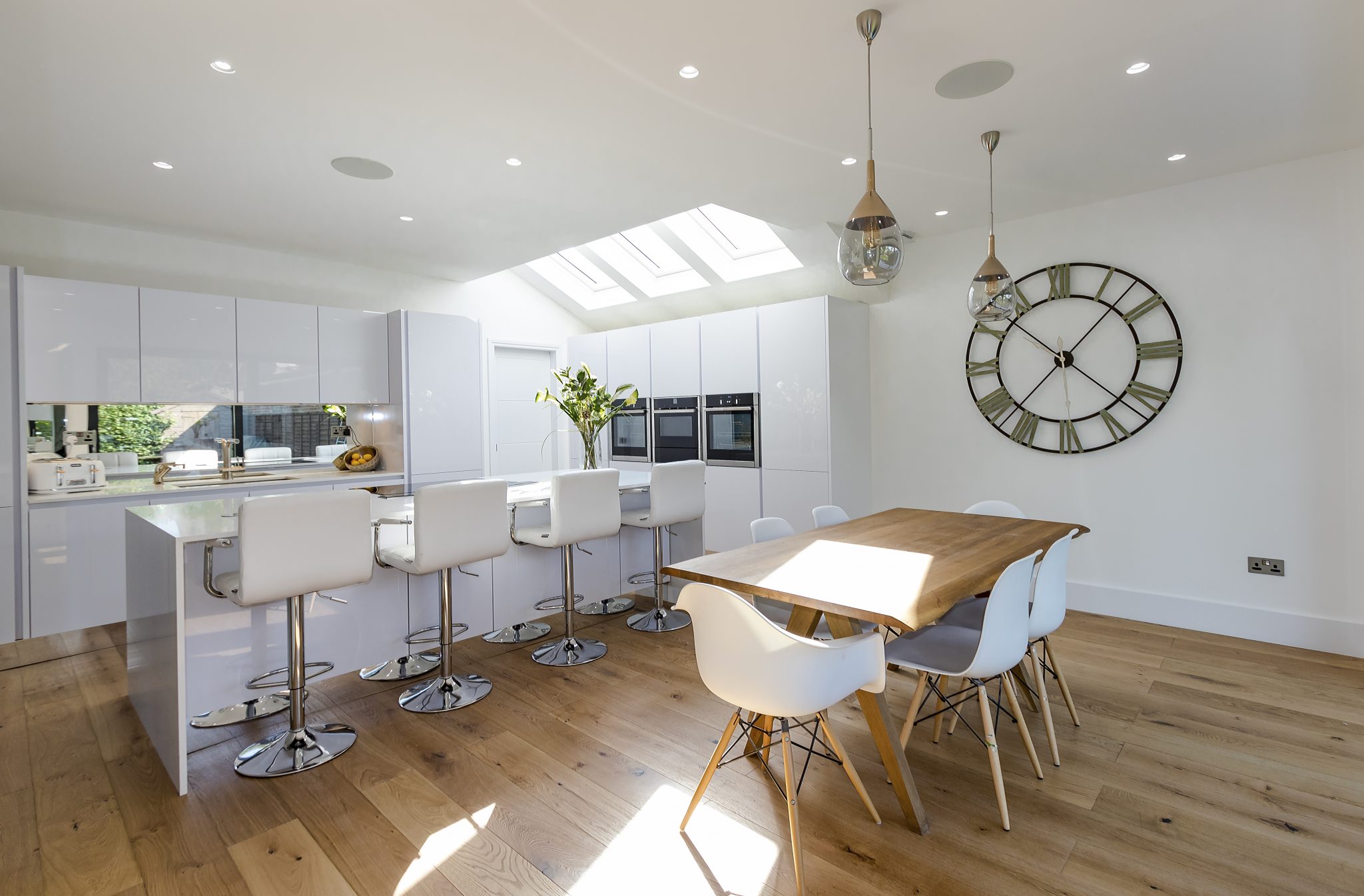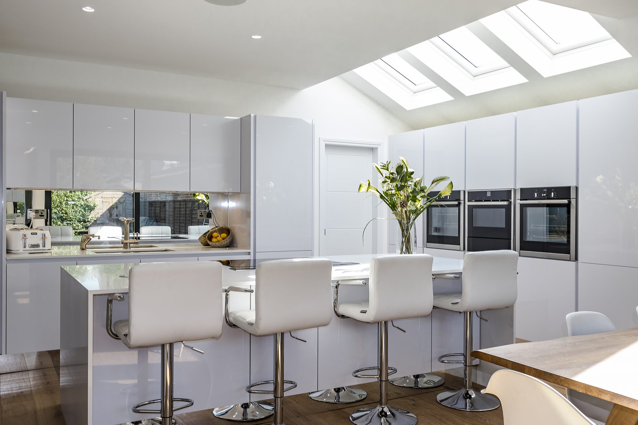This contemporary German kitchen in East Sheen showcases a perfect balance of style, functionality, and premium craftsmanship. The sleek handleless Leicht cabinetry creates a seamless, modern aesthetic, complemented by striking Dekton and Silestone surfaces for durability and elegance. A mirrored splashback enhances the sense of space and light, reflecting natural brightness from the large skylights above.
