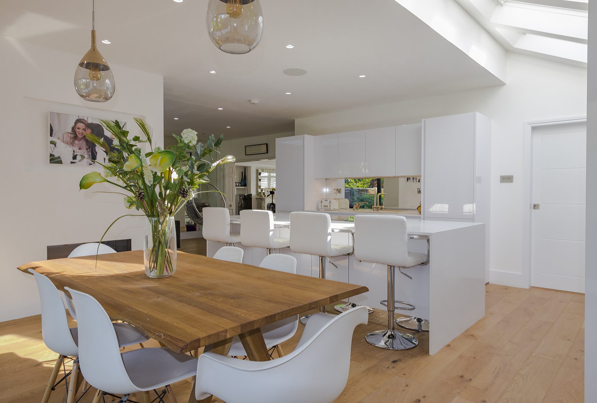 The kitchen is fully equipped with high performance Siemens appliances, a Franke sink, and a Quooker tap for instant boiling water. Neolith surfaces add another layer of sophistication and resilience, ensuring the design is as practical as it is beautiful. The generous island with breakfast seating serves as both a focal point and a social hub, ideal for family life and entertaining.