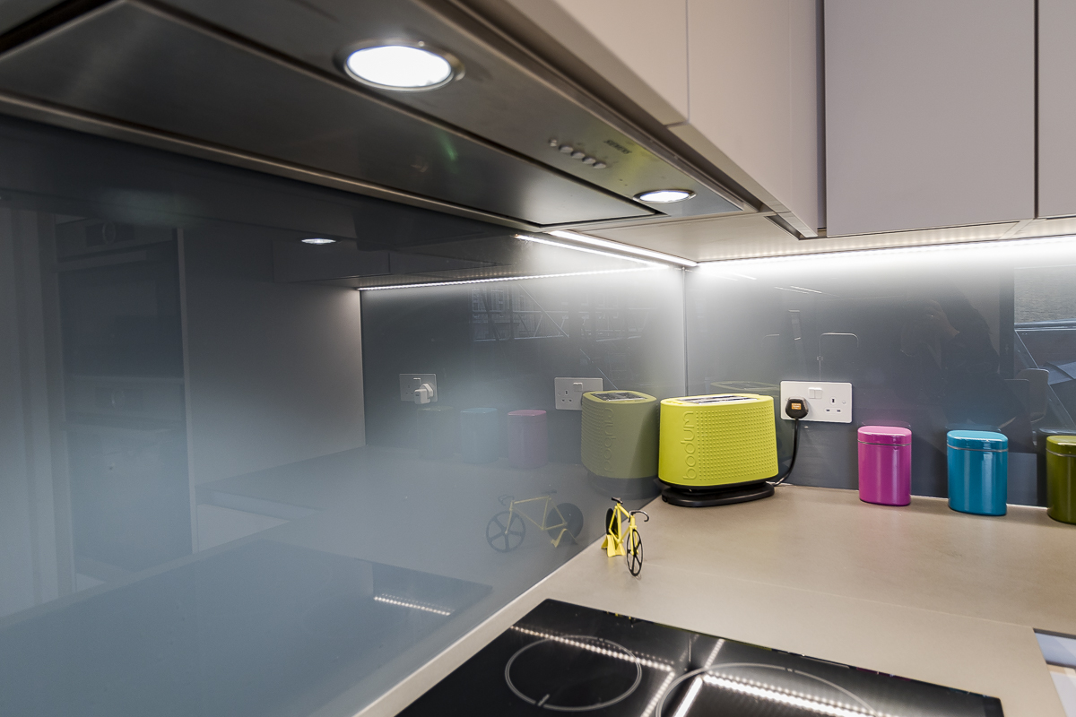 This handleless kitchen in Southwark is designed with simplicity and efficiency at its core. The clean lines of the cabinetry, finished in a soft neutral tone, are paired with a sleek dark worktop and splashback for a modern, understated look. Integrated LED strip lighting adds both function and atmosphere, highlighting the uncluttered design.