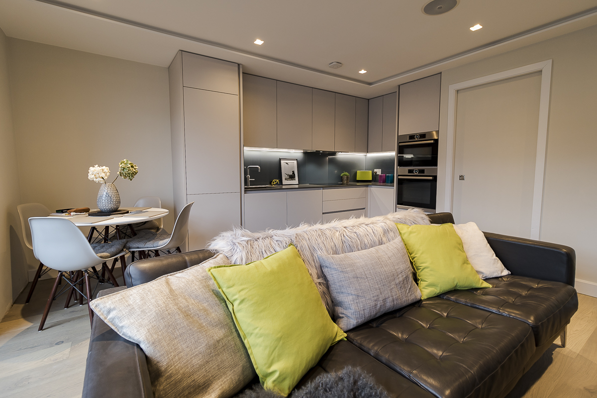 Seamlessly built-in appliances, including a double oven and integrated fridge, ensure maximum performance within a compact layout. The open-plan design connects the kitchen effortlessly to the living and dining area, making it a highly functional yet stylish hub for city living.
