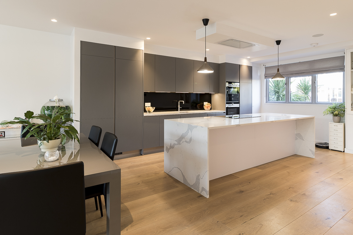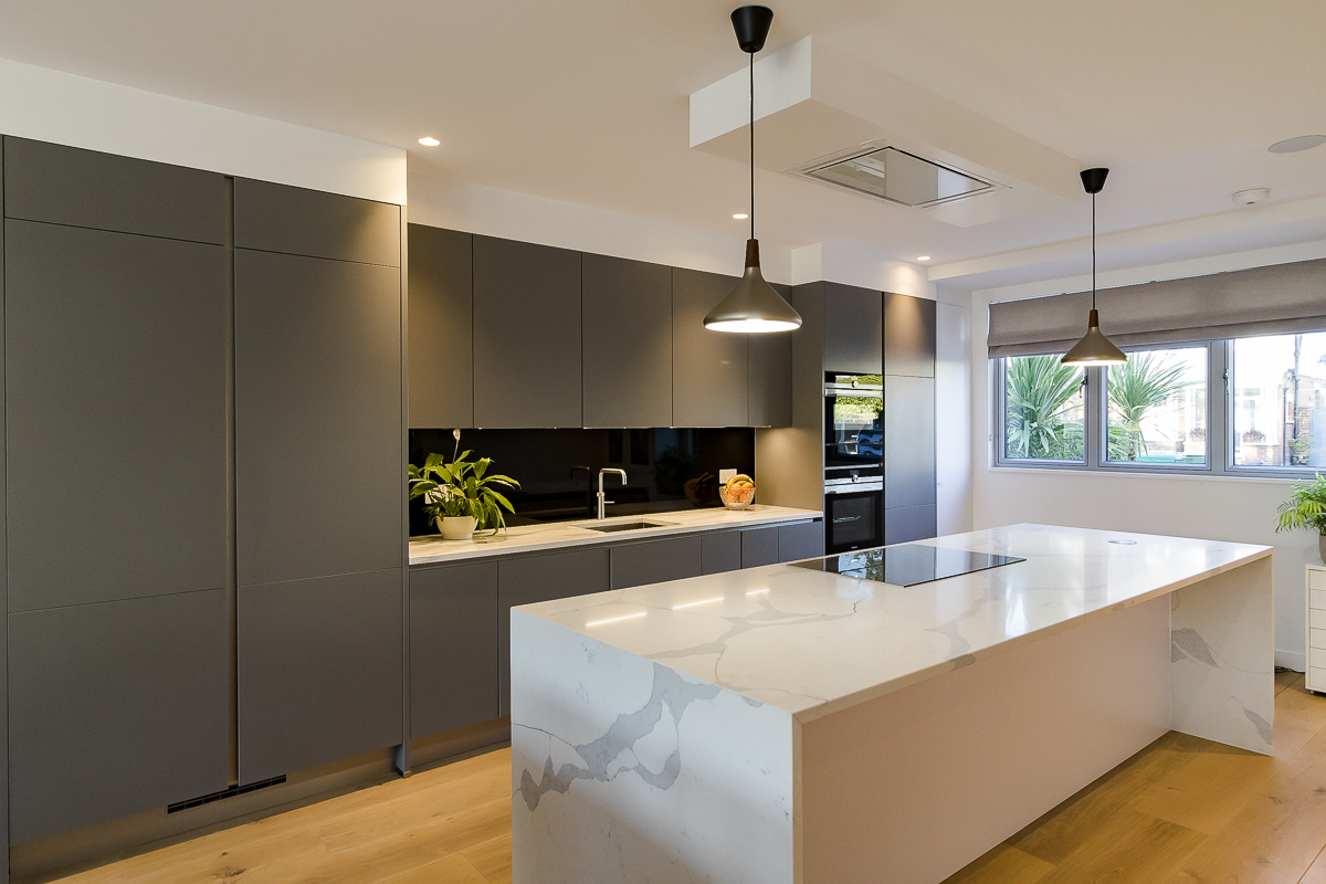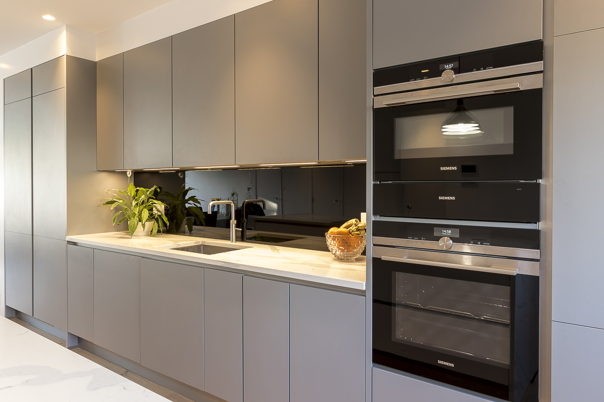Quality handleless Leicht cabinets and fronts have been selected in tasteful neutral tones, making this kitchen bright, open and spacious. A black glass splashback adds sophisticated drama and compliments the dark tones of the Siemens integrated double oven.