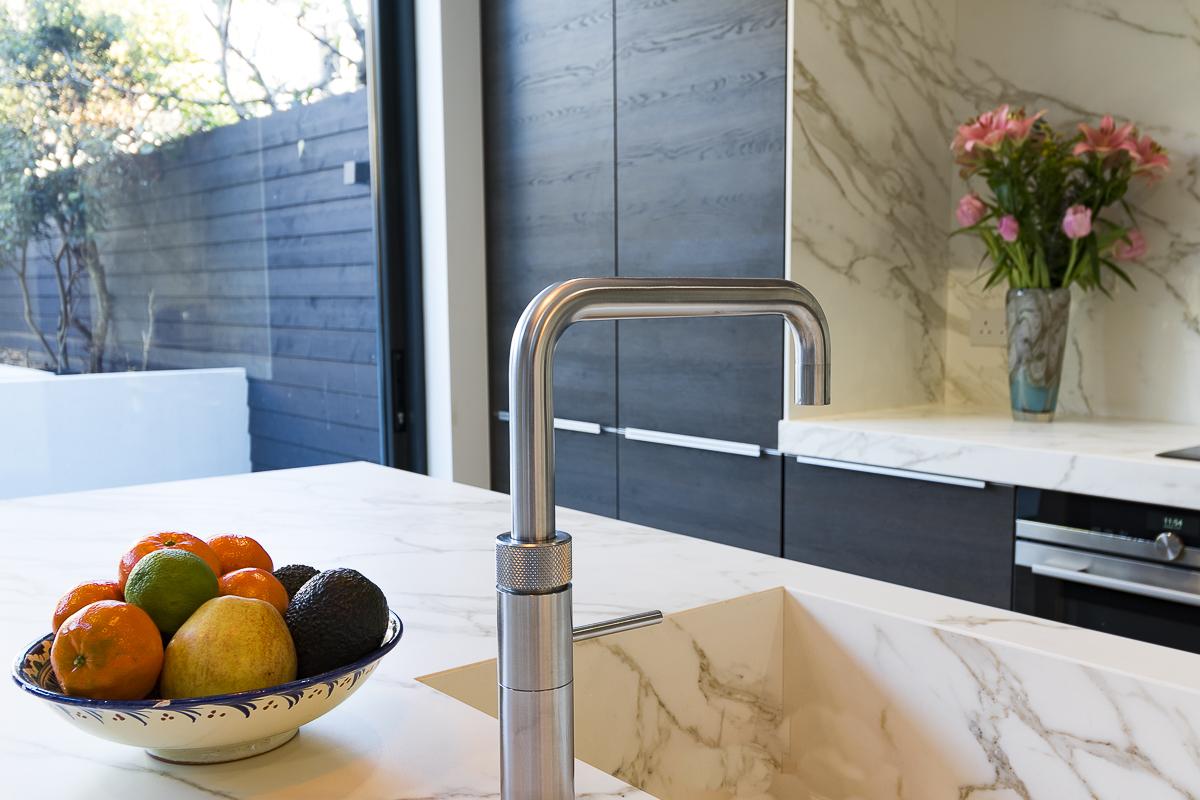 Spectacular floor to ceiling cabinets in Leicht carbon grey line a single wall. Punched into the centre, a contrasting work area in white marble-effect Corian worktop and splashback.