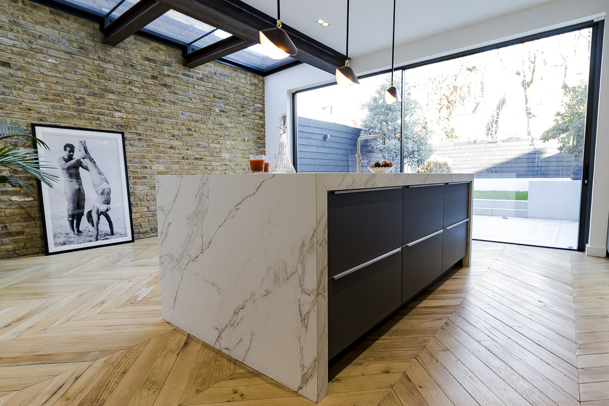 A dramatic kitchen island clad in matching Corian lines up to the millimetre with its backdrop sitting upon a decadent oversized herringbone parquet floor.