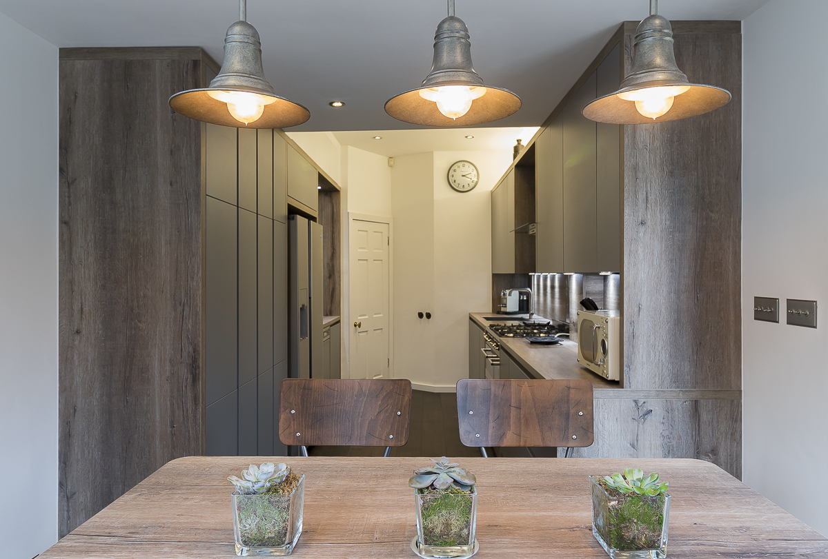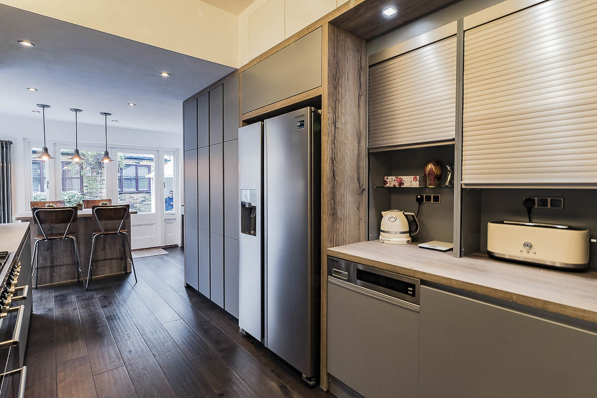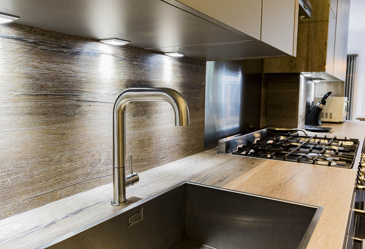 This Leicht kitchen in Ealing, London, showcases a refined balance of style and practicality. Sleek handleless cabinetry is paired with warm wood accents, creating a contemporary yet welcoming feel. The wood effect splashback and worktops add texture and character, complemented by integrated LED lighting that highlights the clean lines of the design.