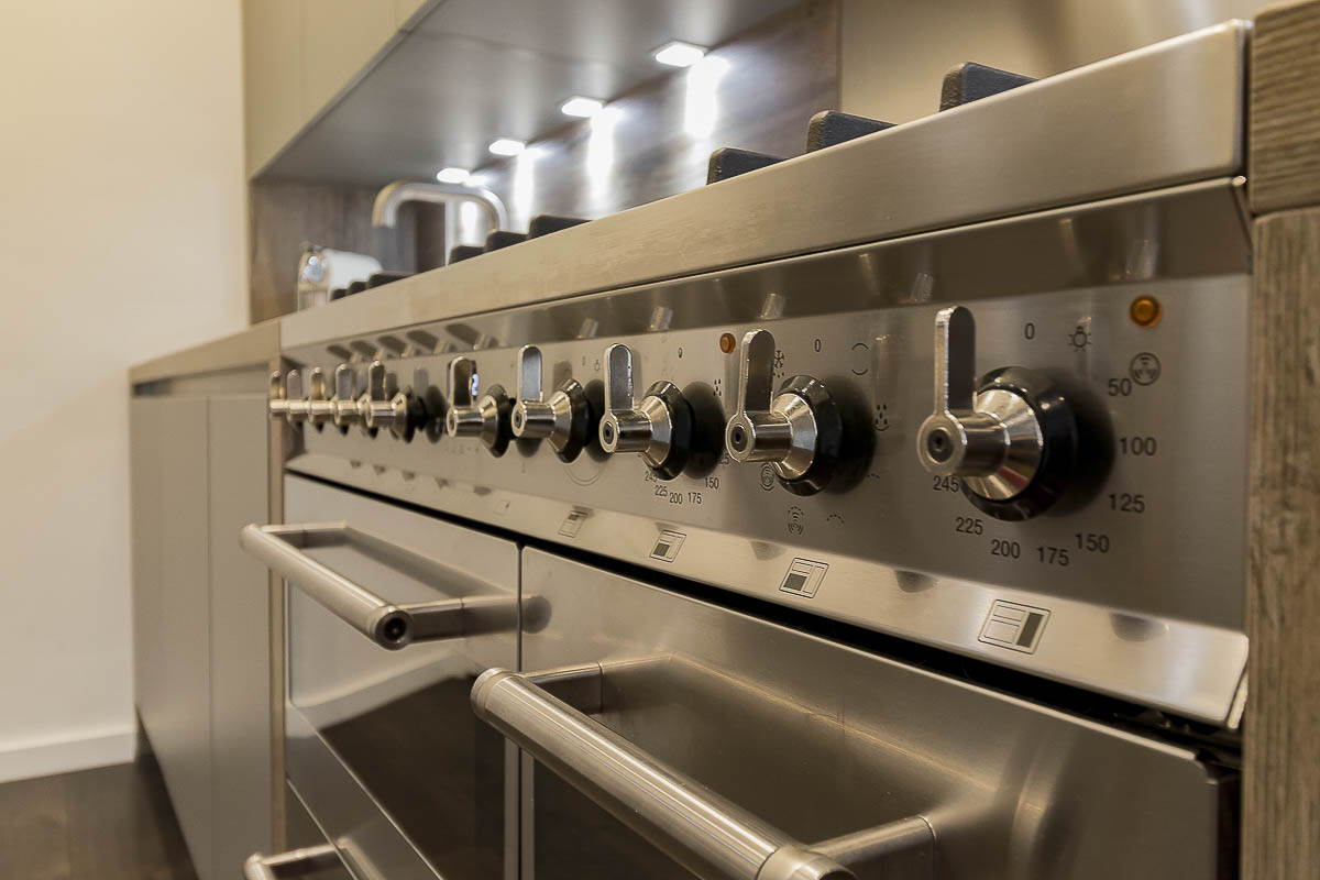 A stainless steel range cooker takes centre stage, providing professional level performance, while modern integrated appliances and a flush mounted sink ensure efficiency for everyday use. The open layout maximises both workspace and storage, making the kitchen highly functional without compromising its modern elegance.