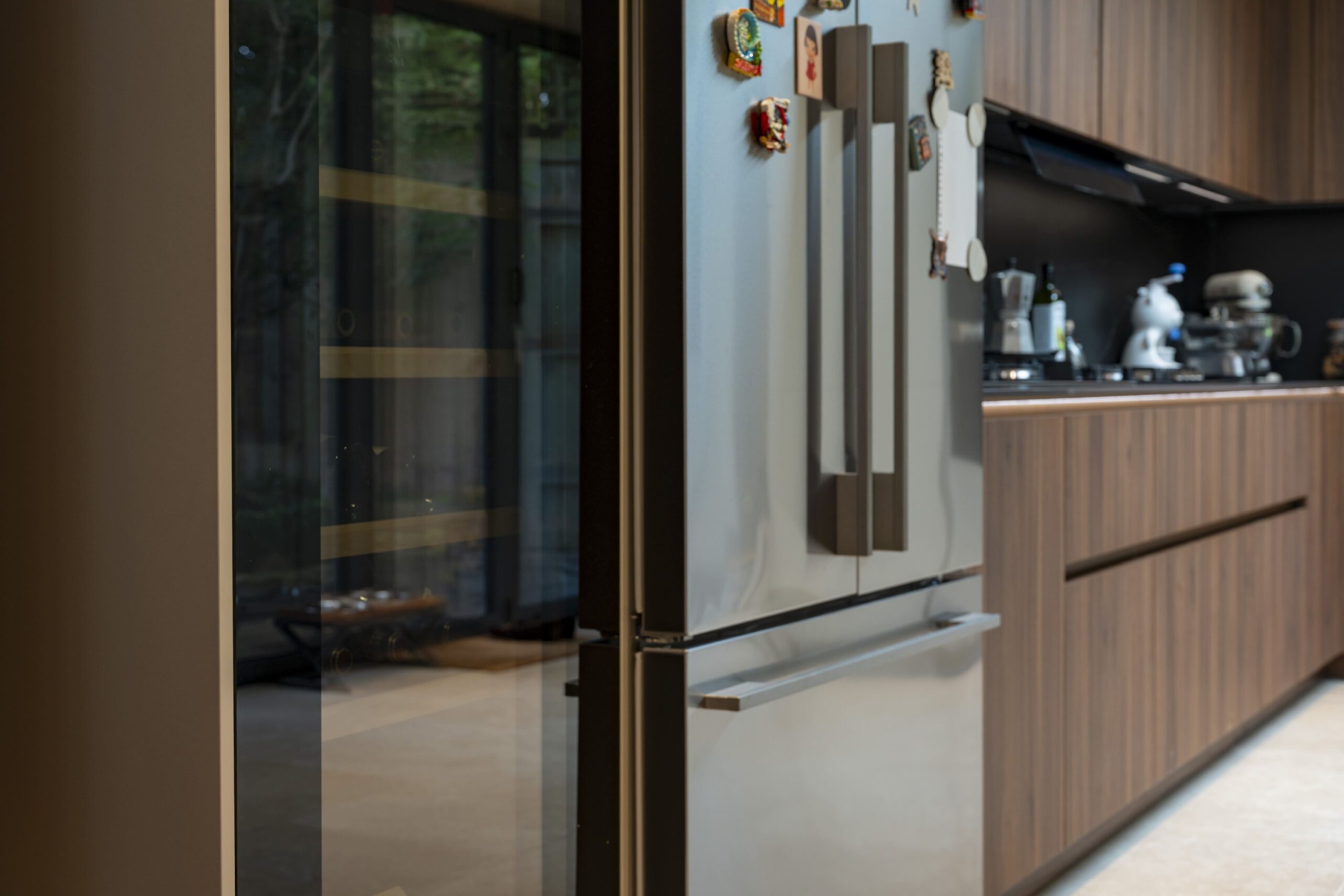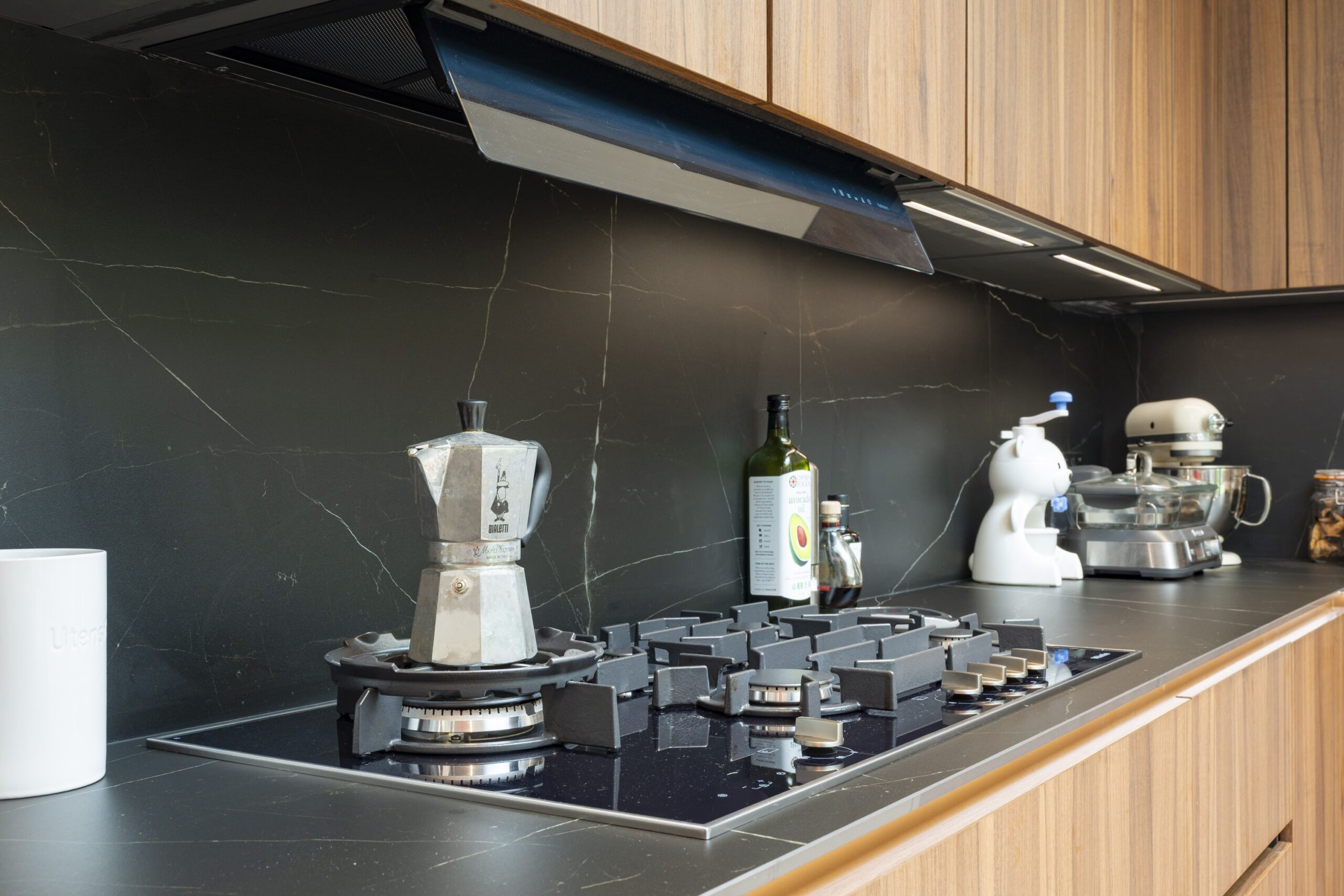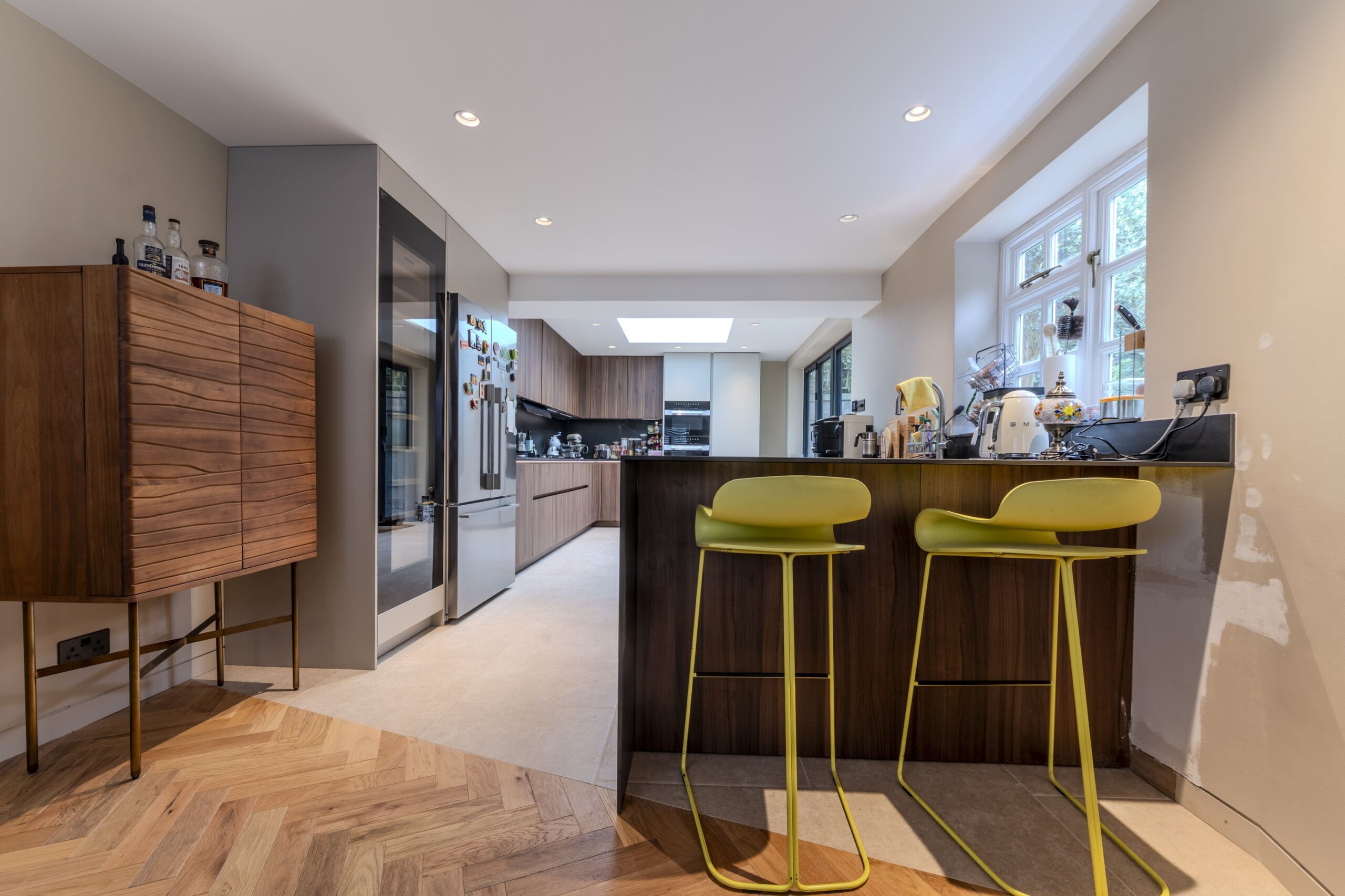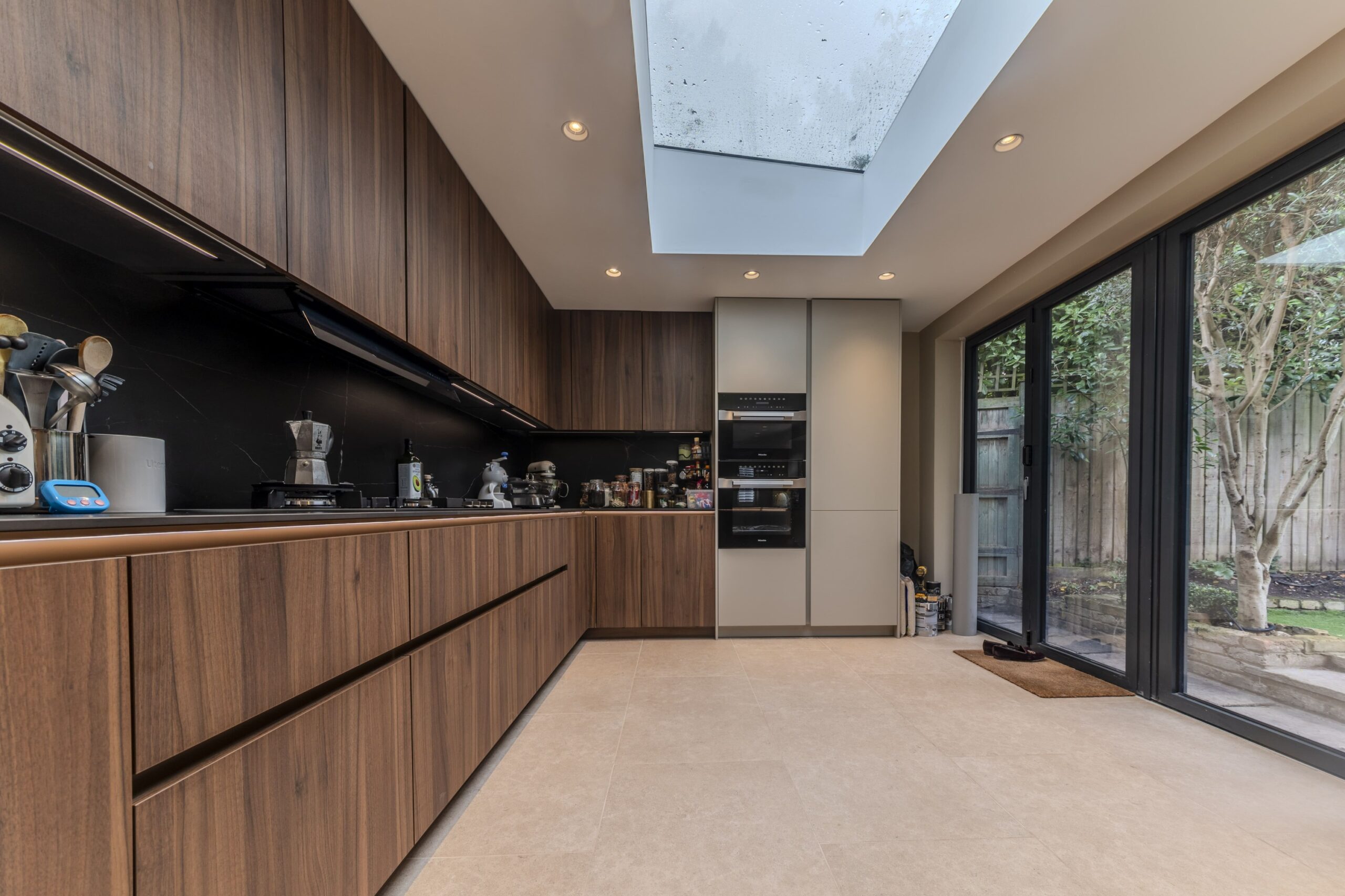High-performance appliances include a Miele gas hob, oven and compact microwave oven, a Liebherr Vinidor built-in wine fridge, and a Fisher & Paykel Series 7 French Door Refrigerator with ice maker. A Falmec Virgola NRS extractor and Quooker tap complete the space, combining practicality with modern convenience.