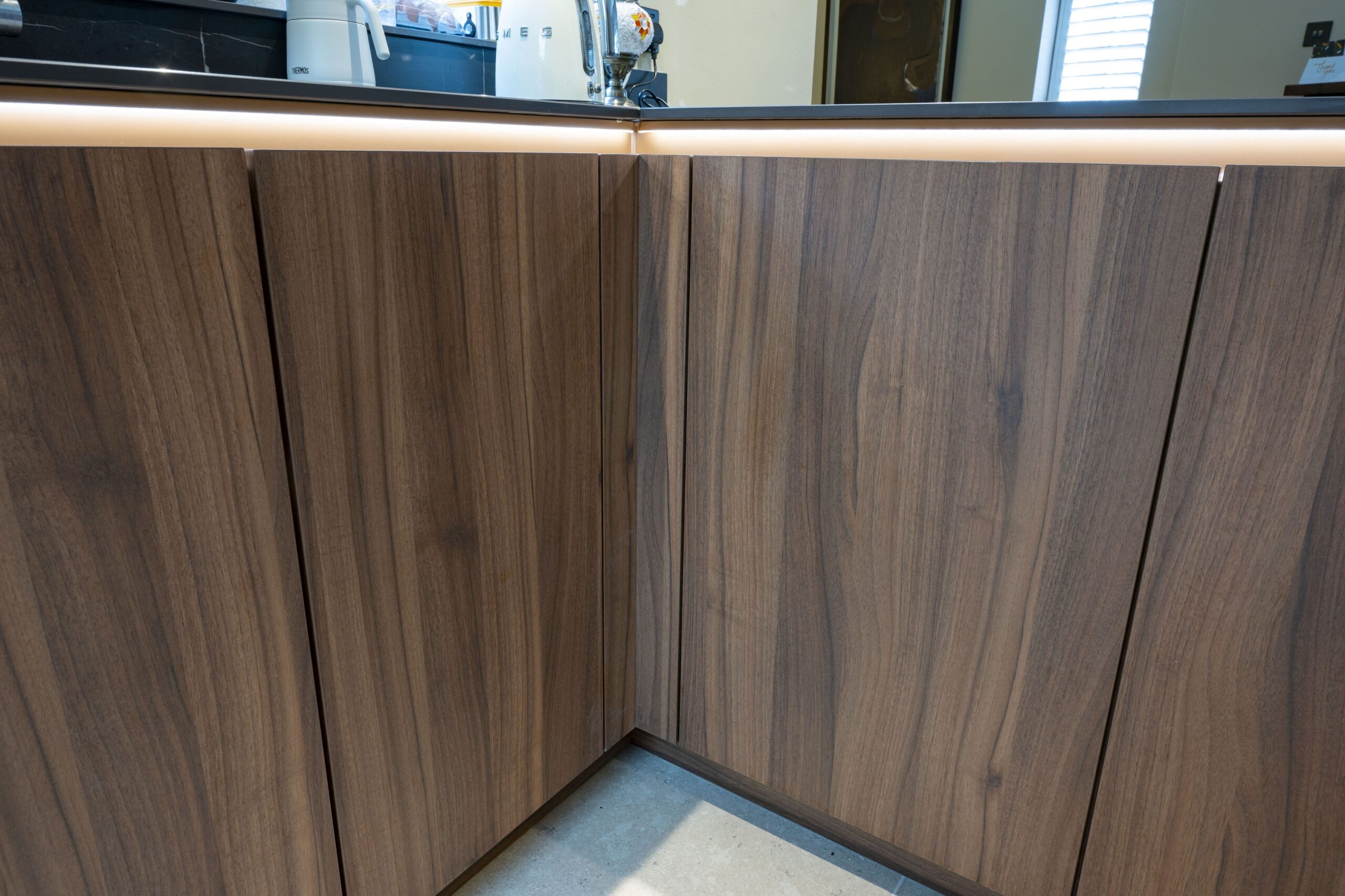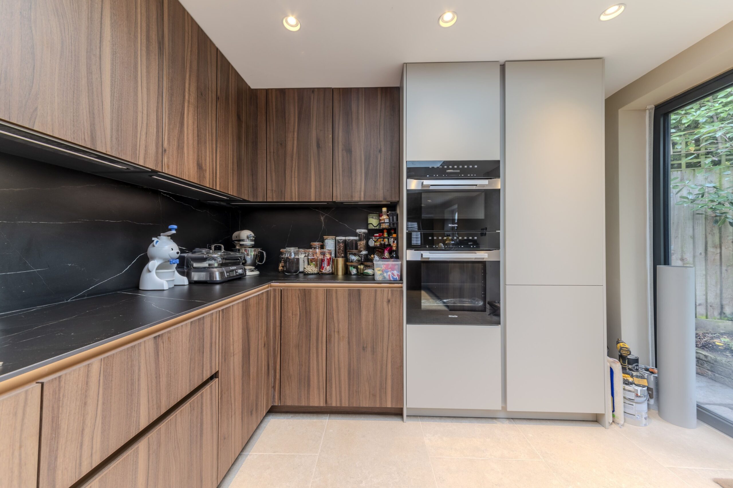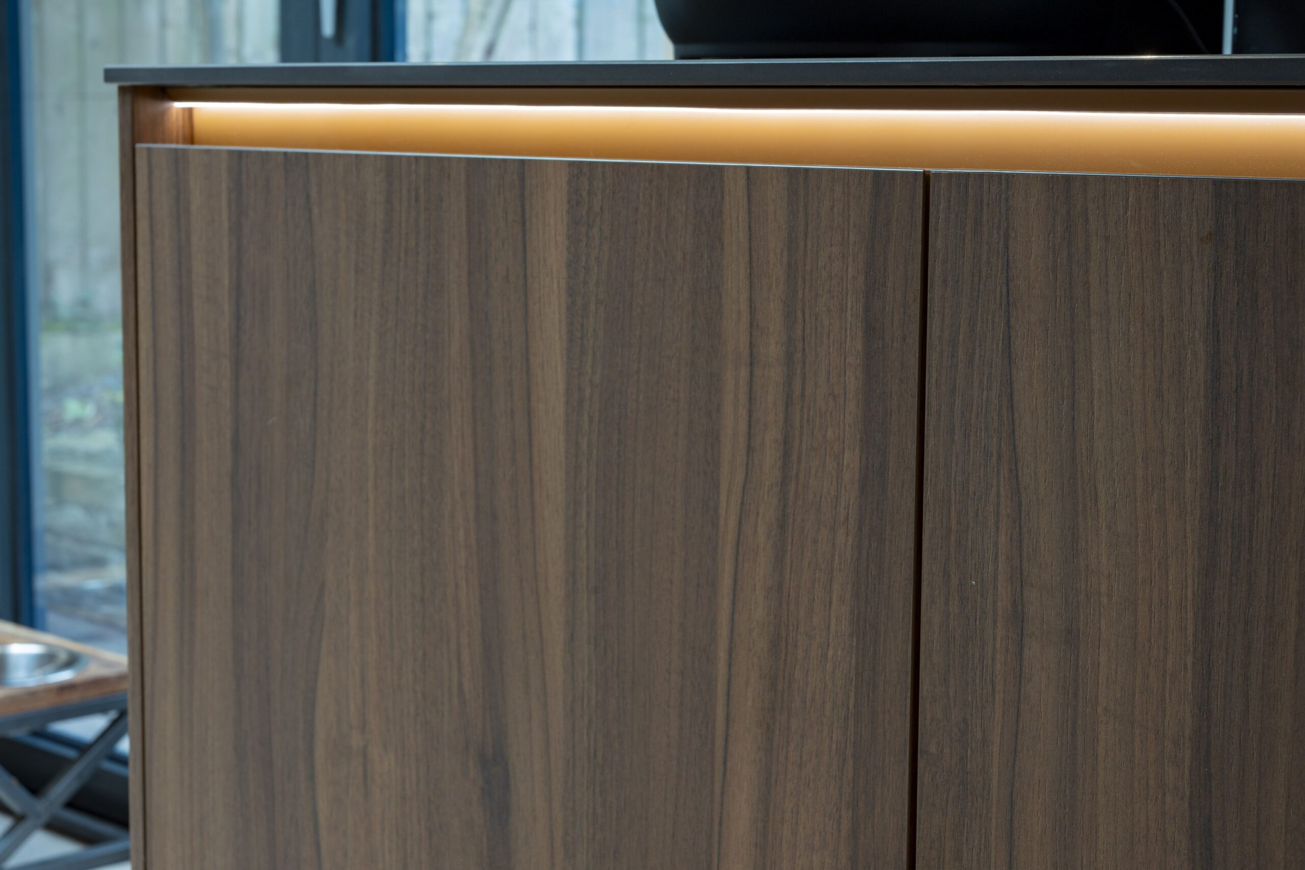 This Leicht kitchen combines the Ceres and Orlando ranges in Cashmere and Walnut Le Midi to create a modern and functional space. The soft cashmere finish contrasts with the natural walnut grain, bringing warmth and balance to the clean, contemporary layout.
