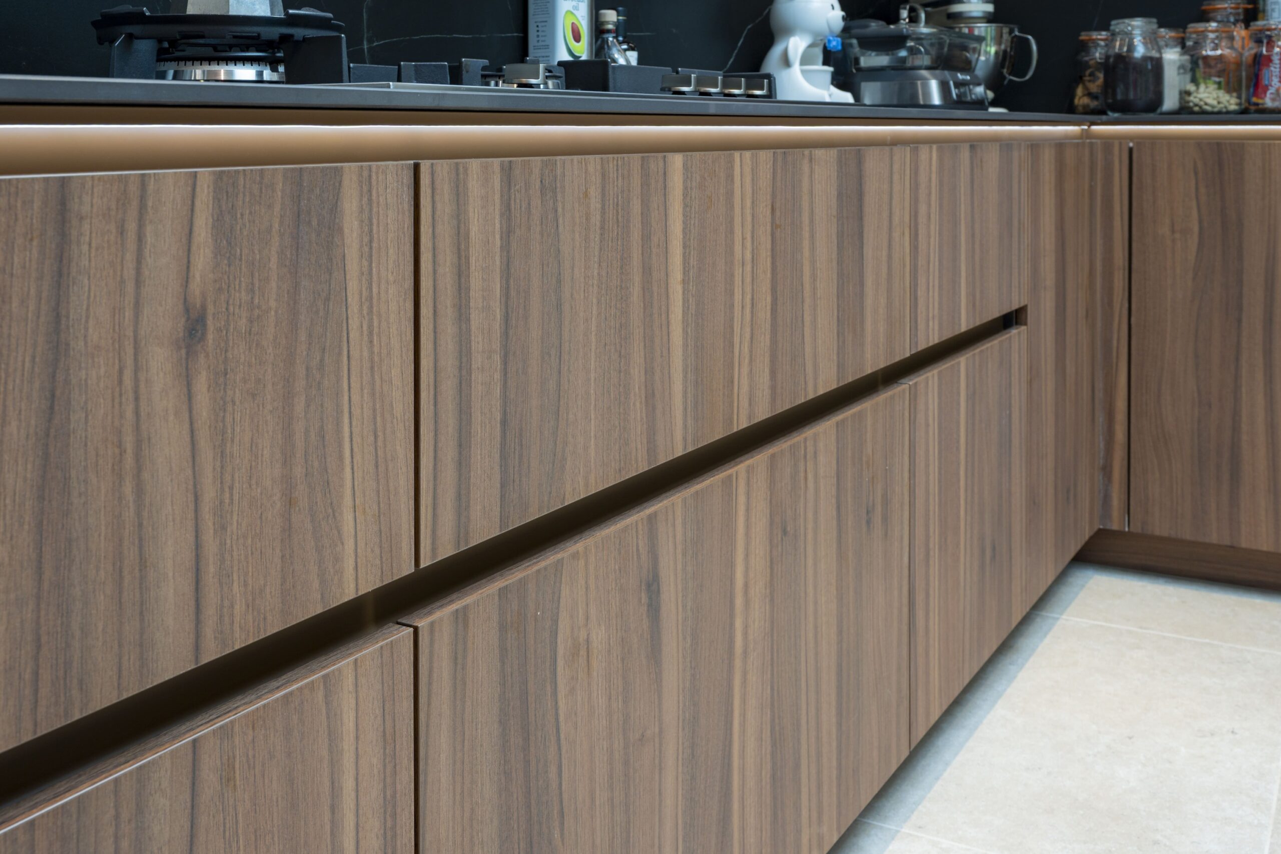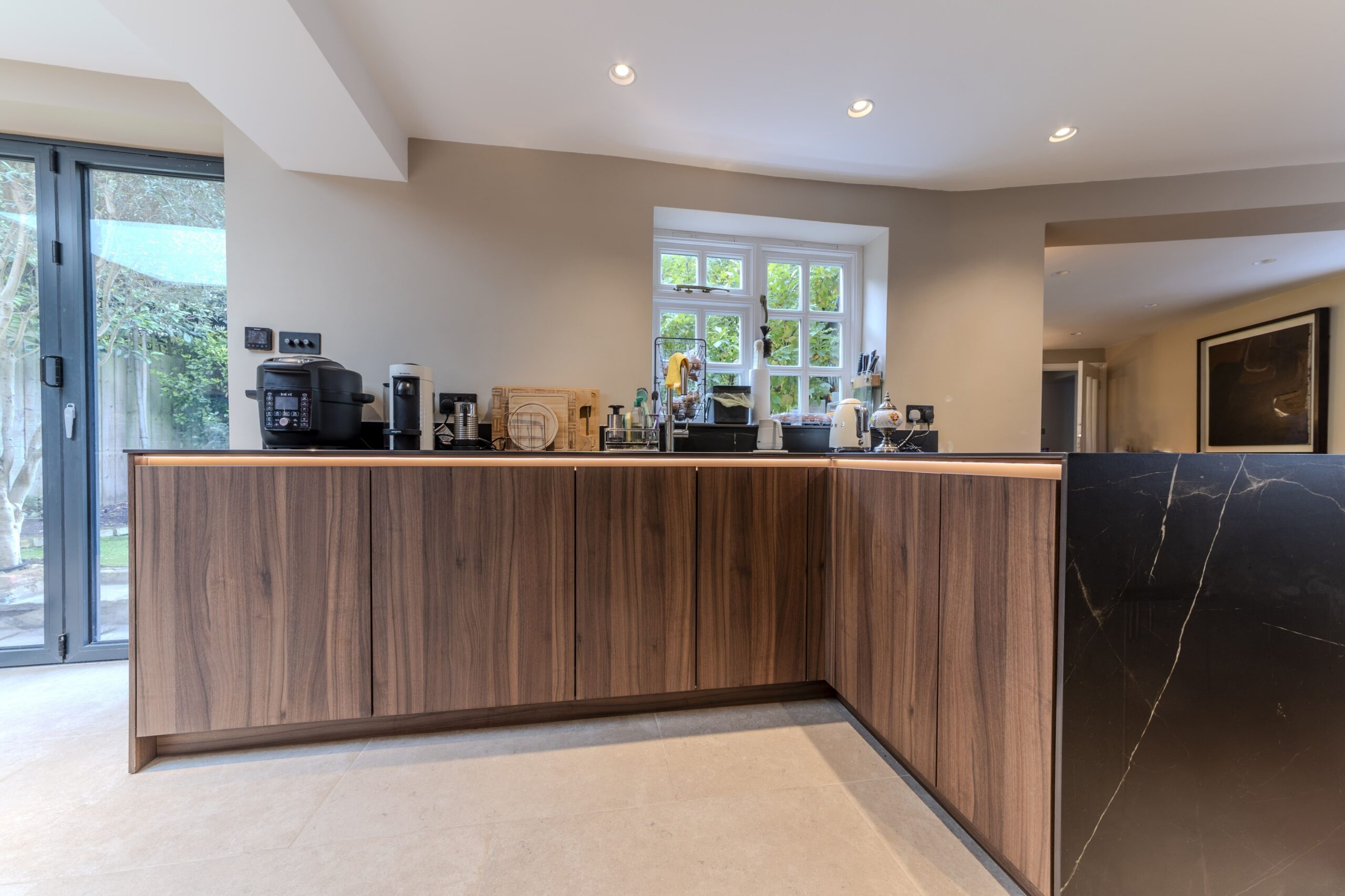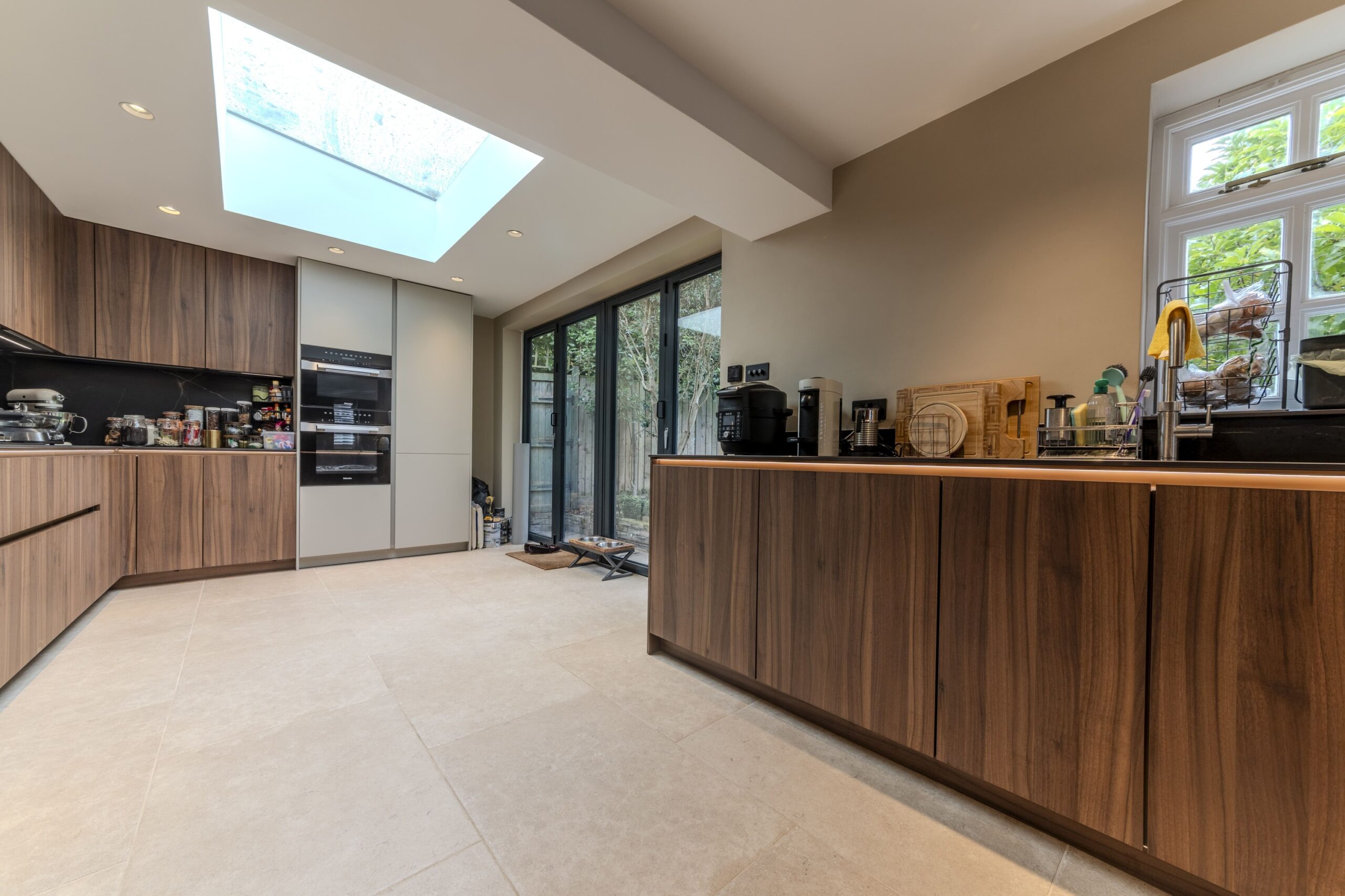 This Leicht kitchen combines the Ceres and Orlando ranges in Cashmere and Walnut Le Midi to create a modern and functional space. The soft cashmere finish contrasts with the natural walnut grain, bringing warmth and balance to the clean, contemporary layout.