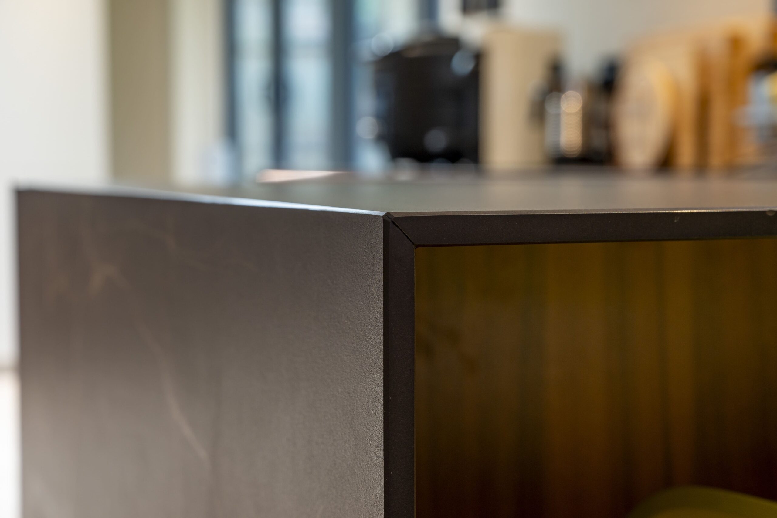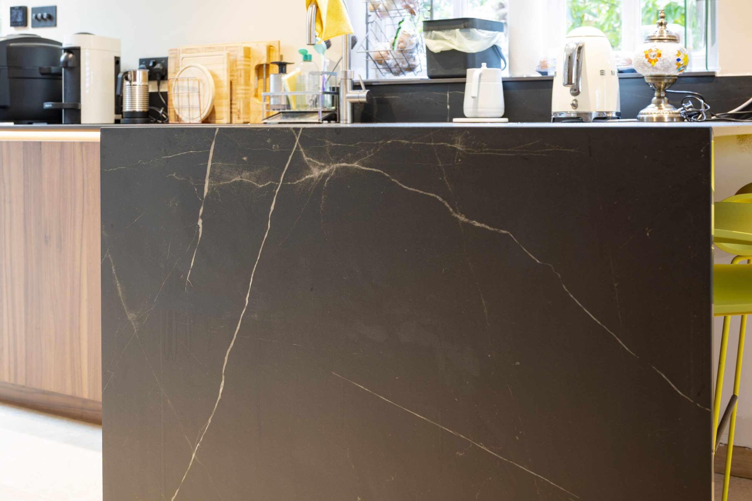 Bespoke floor-to-ceiling cabinetry makes full use of the available height, with recessed handle lighting adding subtle definition. The 12mm Caesarstone 510 Impermia worktop and splashback provide a sleek, durable surface, complemented by a mitred peninsula side panel that gives the design a strong architectural edge.