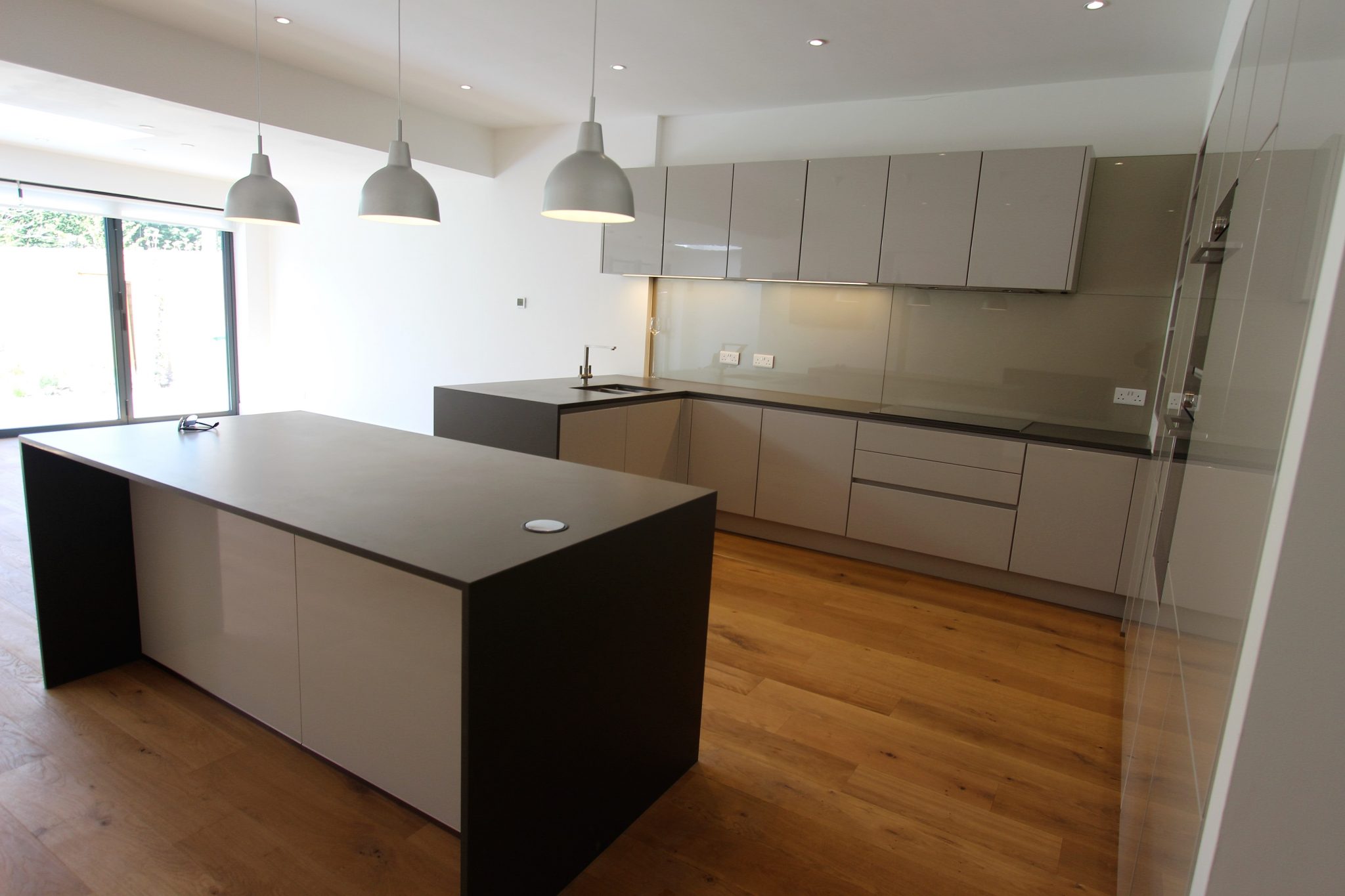 This sophisticated Leicht kitchen embraces clean lines and a refined modern aesthetic. The glossy cabinetry creates a sense of space and light, while the contrasting dark worktops add depth and drama. The expansive island offers both preparation space and a stylish social hub, highlighted by a trio of pendant lights.