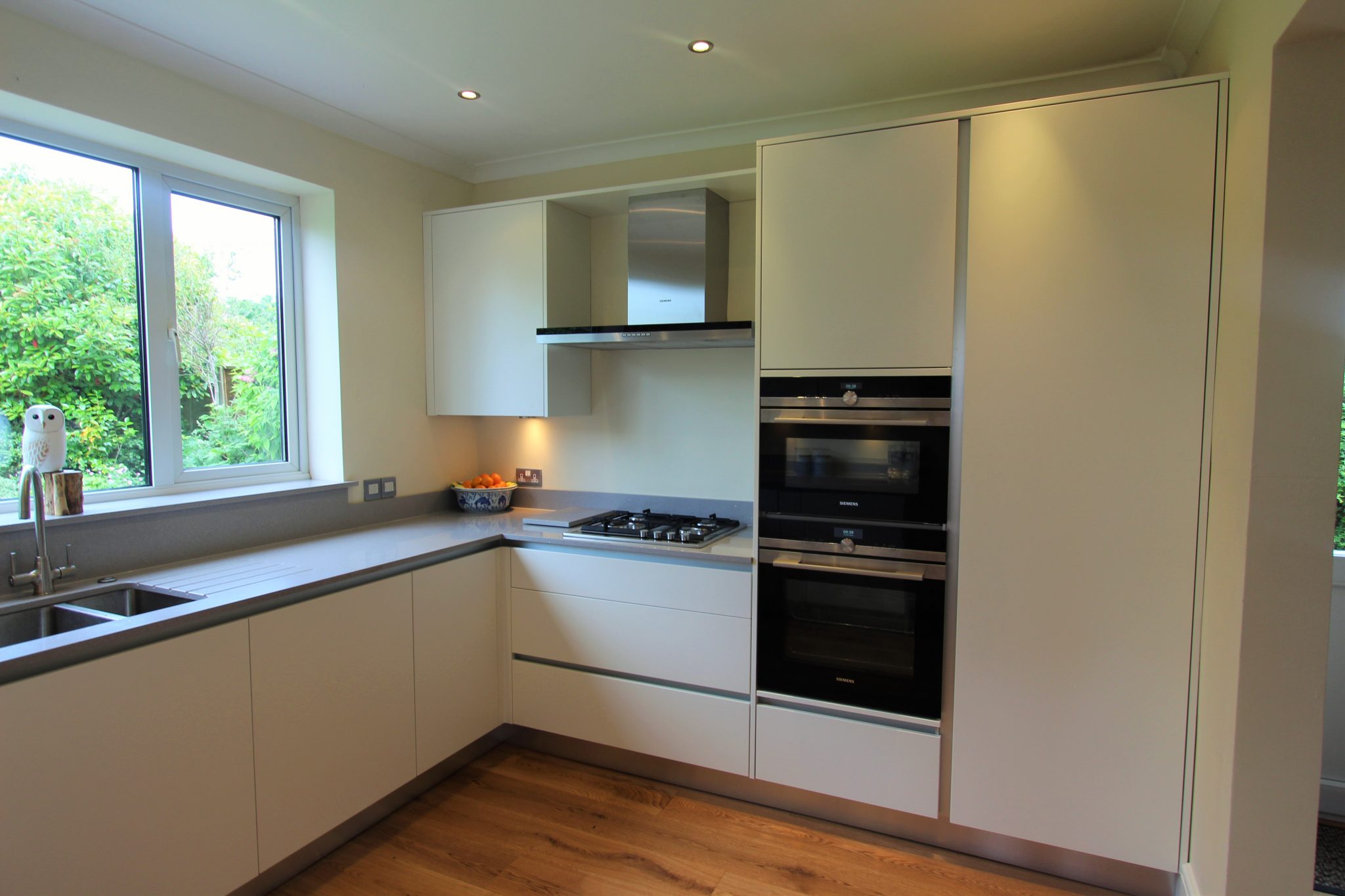 This elegant Leicht kitchen is designed to maximise light, space, and everyday practicality. The handleless cabinetry in a soft, neutral finish pairs seamlessly with understated grey work surfaces, creating a calm and contemporary aesthetic. Warm under-cabinet lighting adds depth and atmosphere, while the large window frames views of the garden, filling the space with natural daylight.
