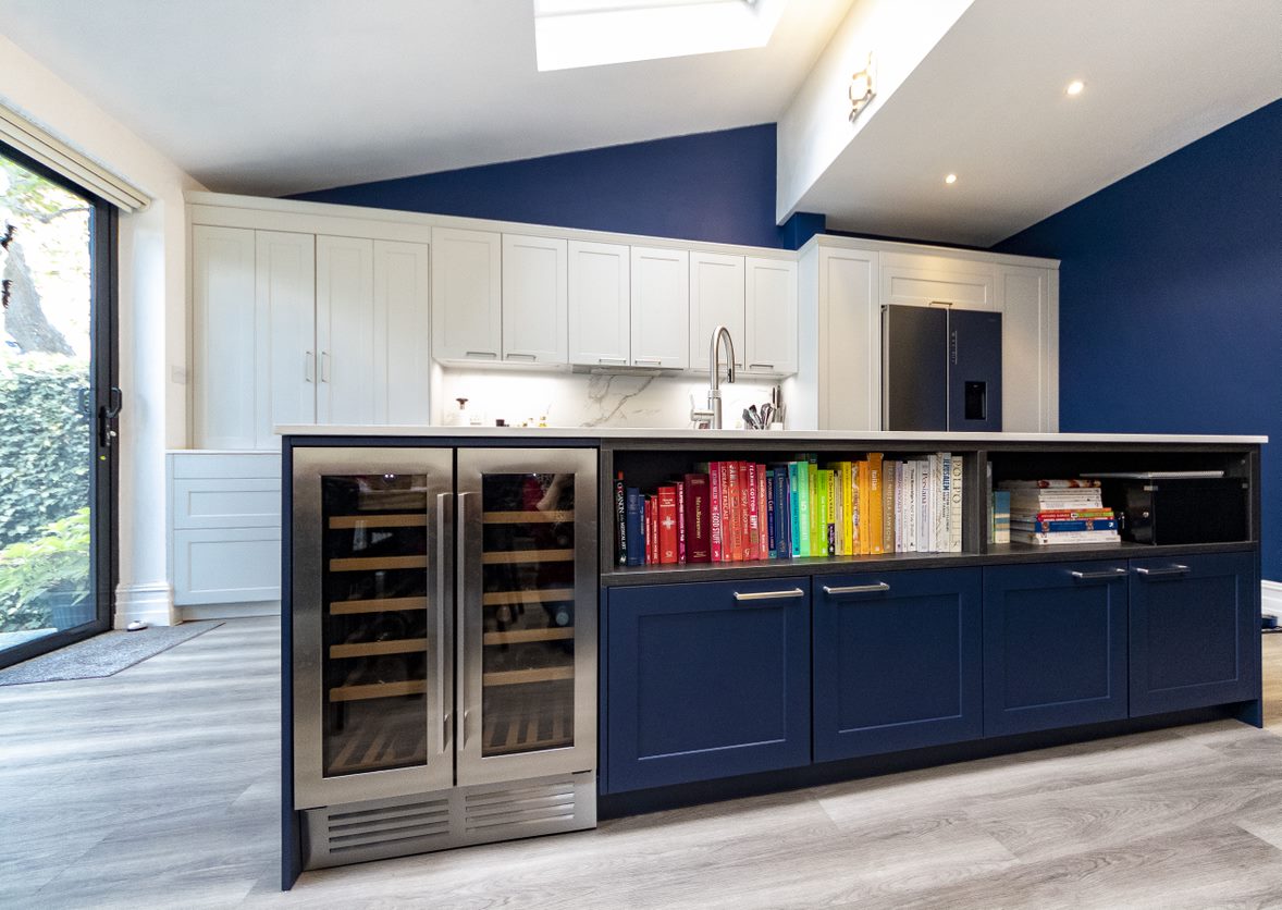 This timeless kitchen combines traditional craftsmanship with modern performance. Leicht Carre-FS cabinetry in Midnight Blue creates a rich, classic look, balanced by sleek white Dekton Aura worktops and a bold white toughened glass splashback. The result is a sophisticated space that feels both contemporary and enduring.