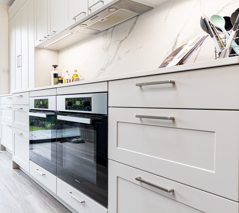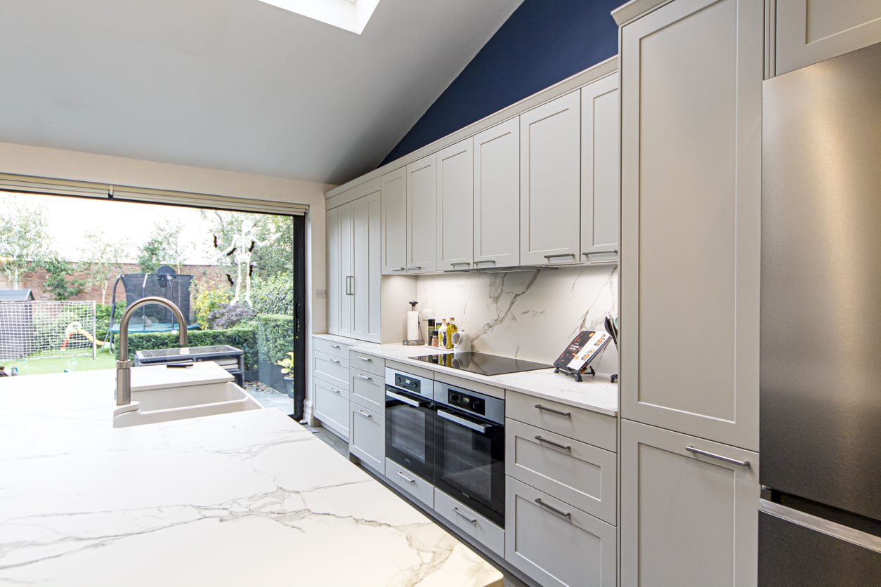 Practicality meets style with a Franke double bowl Belfast sink in ceramic, paired with a Quooker PRO3 Flex stainless steel tap for ultimate convenience. Premium appliances include a Neff 80cm induction hob, Luxair canopy cooker hood, and a Caple wine cooler, ensuring the kitchen is fully equipped for modern living.
